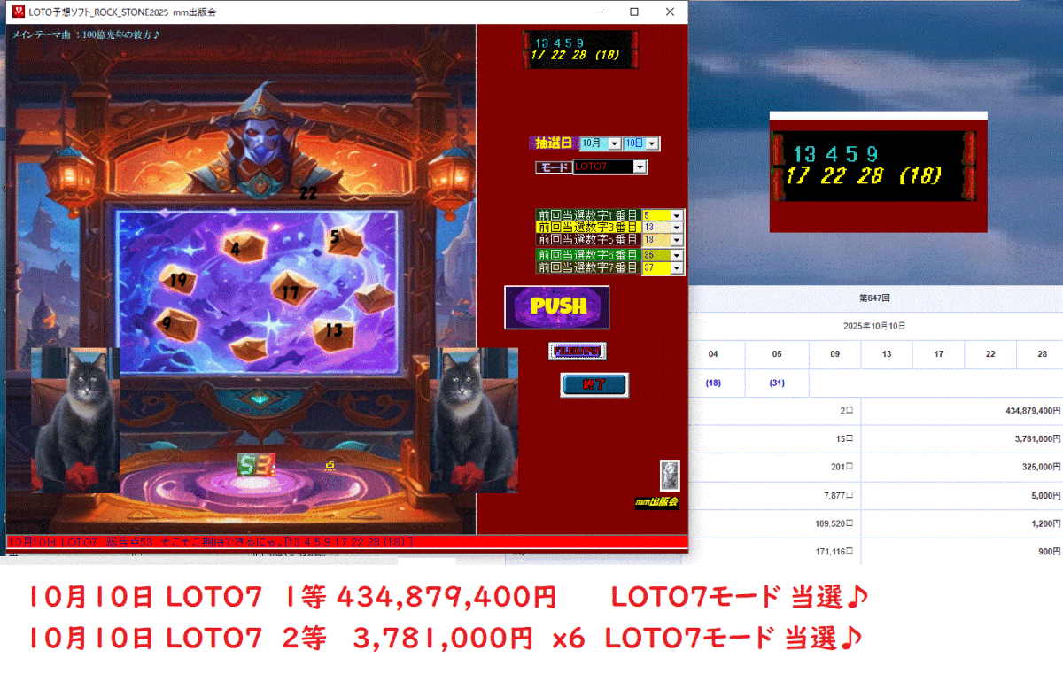 [LOTO予想ソフト_ROCK_STONE2025   ]10月10日 LOTO7  総合点53  そこそこ期待できるにゃ。[13 4 5 9 17 22 28 (18) ]