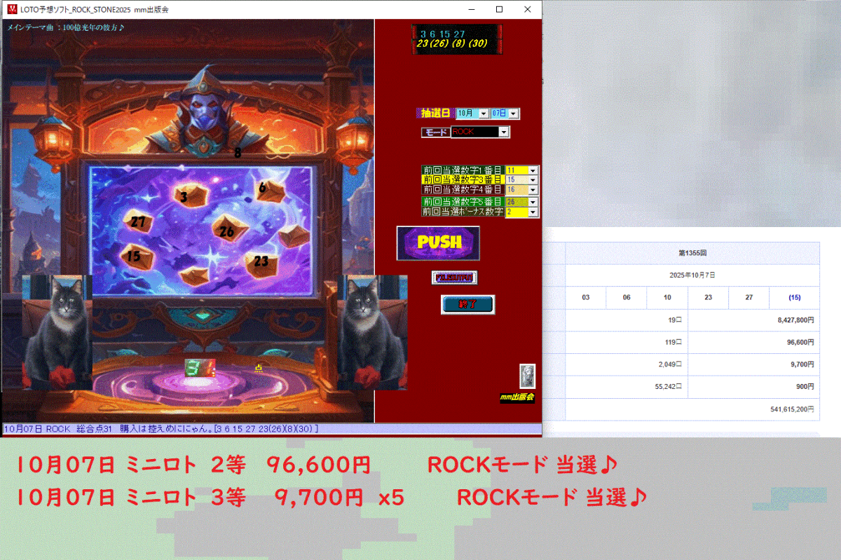 [LOTO予想ソフト_ROCK_STONE2025   ]10月07日 ROCK  総合点31  購入は控えめににゃん。[3 6 15 27 23(26)(8)(30) ]