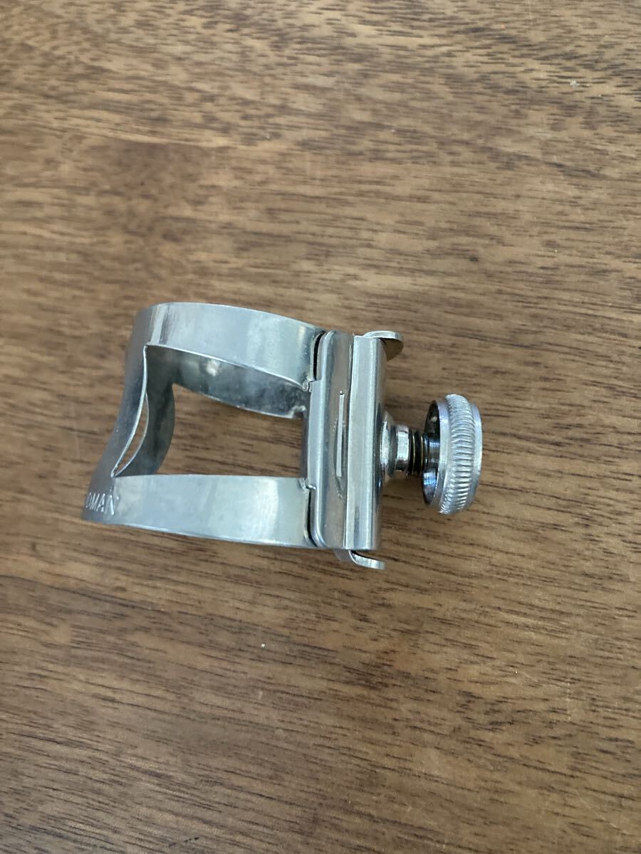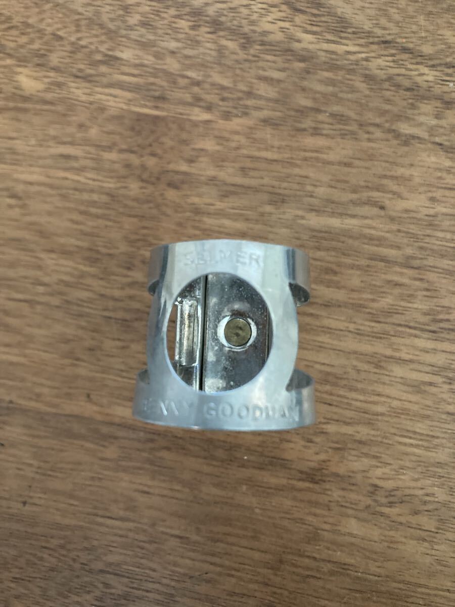 ベニーグッドマンシグネチャーのビンテージリガチャーです。SELMERのロゴが小さく50年代か60年代の古いリガチャーでネジ部が重量感のあるネジです。肝心の音ですが、非常に良く鳴るリガチャーで現代のリガチャーにはない味わいと音量でした。