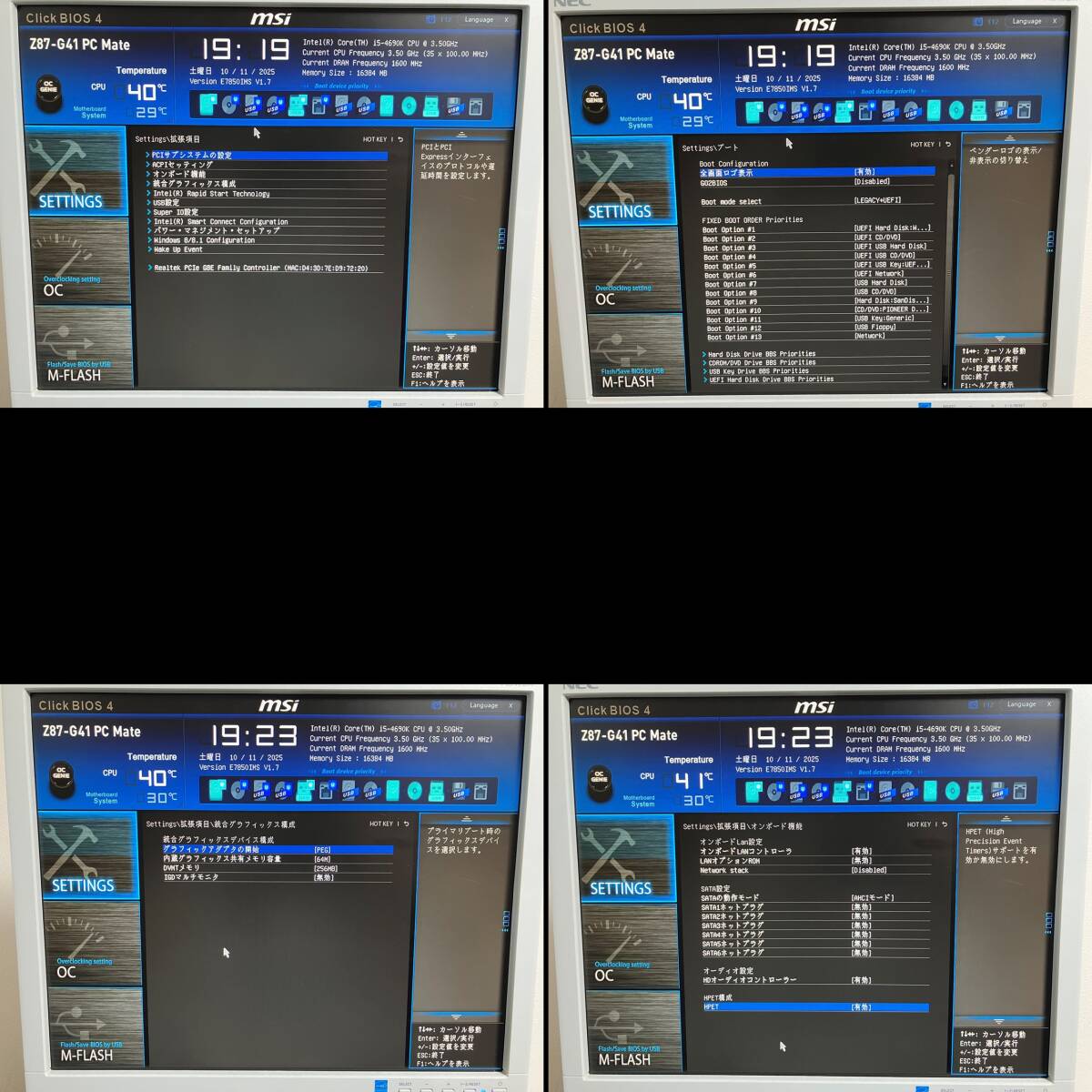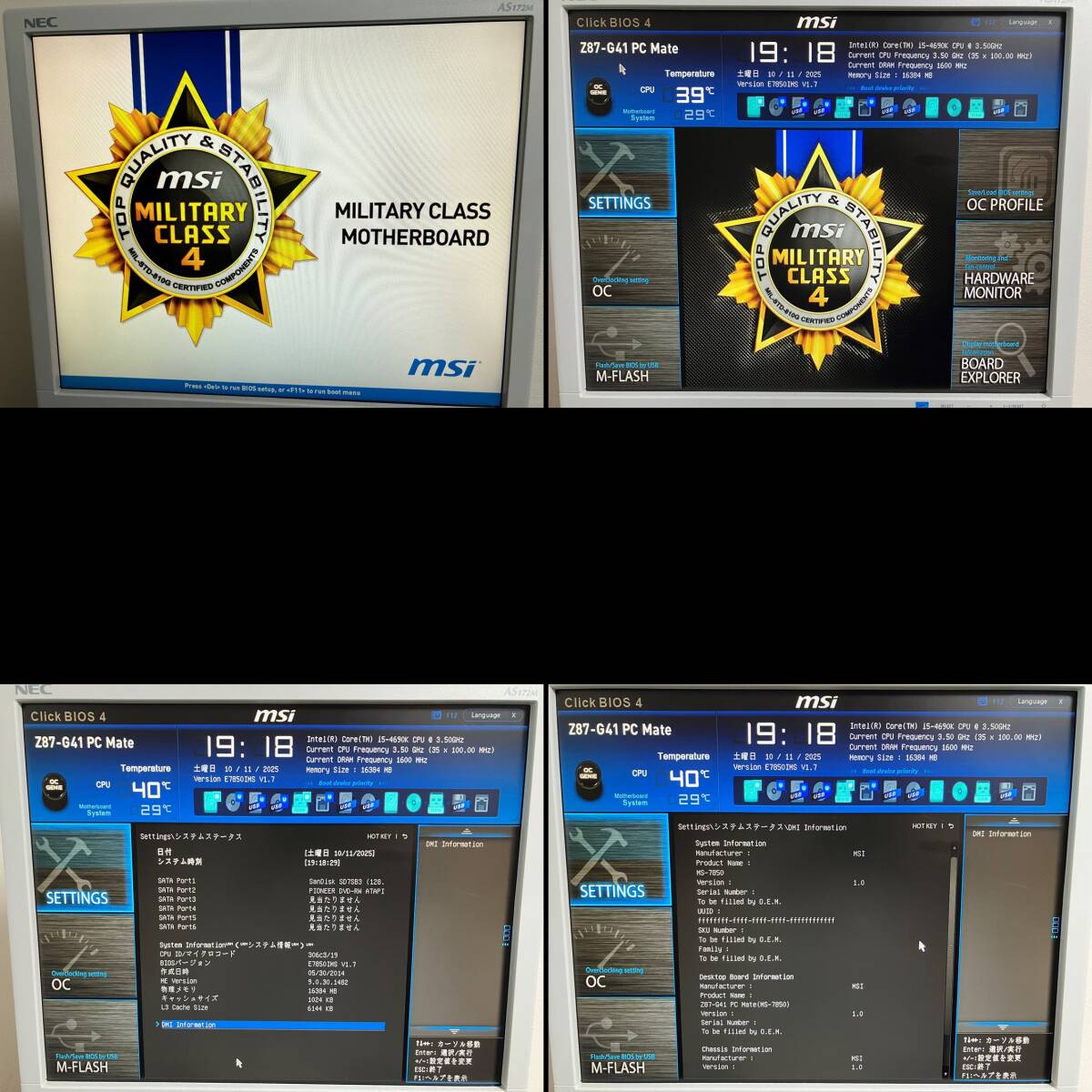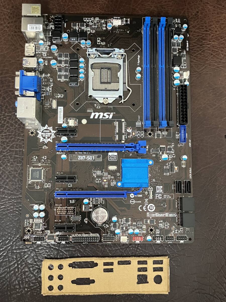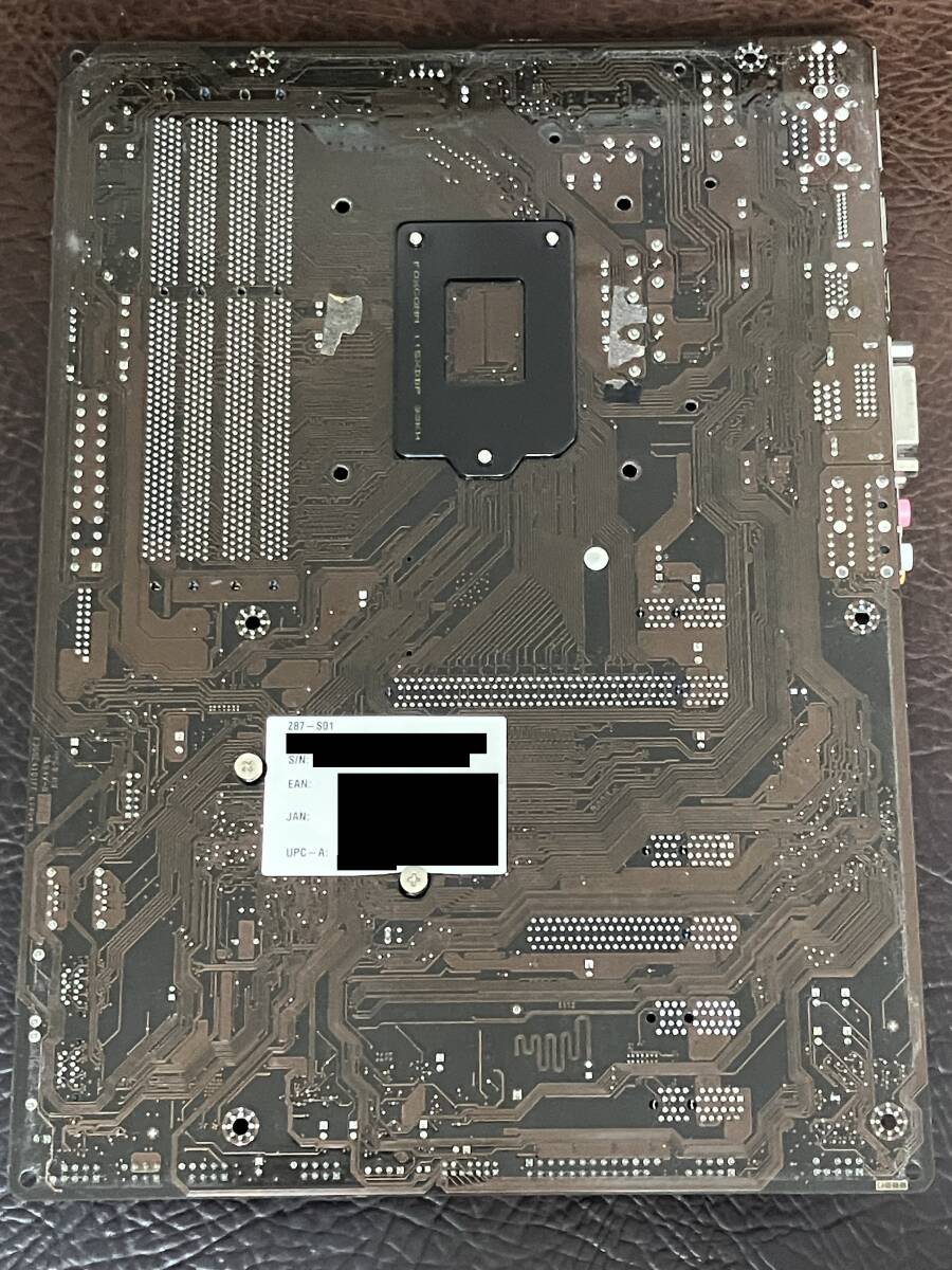 MSIのATX規格のマザーボードである Z87-S01 REV:2.1 を出品します。 USBブート対応、UEFI対応なマザーボードです。 mouse computer系列向けのOEMマザーボードでありますが、 BIOS壊れて起動できなかったため、 元となったであろうマザーボードである MSI Z87-g41 PC MATEの 最新版BIOSをROM焼きでぶち込んであります。 そのため、このマザーボードで本来だったら発生する、 再起動が確定で失敗する不具合が発生しません。 UUID吹き飛んでます。 この状態だと、VM環境など、特定用途で影響が出る場合があります。 このマザーボードのBIOSは、AMI(American Megatrends Inc)製 なので、AMIDMI.EXEというツールによる、 ランダムでのUUID書き換えによって、 番号を割り当てることが可能かもしれません。 興味があればメリット・デメリットなど 調べた上でお試しください。 壊れているであろう元BIOSファイルもとってありますので、 必要なら連携可能です。希望する場合はその旨お伝えください。 I/Oパネル無かったため、 段ボールで簡易的に作成しました。 普通のI/Oパネルとは異なり、先付けではなく、後付けです。 マザーボードをケースと固定した後、端子側から嵌め込むことで 取り付けできるようにしてあります。 10枚目の写真のように、メモリ4枚挿しでCPU付けて、 5枚目~6枚目の写真の通り、BIOSが起動することを確認、 7枚目~9枚目の写真の通り、windows 10 pro 64bit UEFI(GPT) で起動することを確認しました。 bios起動確認の際に各端子の動作の確認を行いました ・USB全ポート ・PCI-EXPRESS長いやつ2つ (グラフィックボード Quadro M2000 4GB 、Geforece GTX 760 2GB 、 Geforce GTX 1050Ti 4GB を使用) ・SATA全ポート ・メモリスロット →メモリ4枚挿し ・CPUソケット →CPUは intel core i5 4690k で確認 ・背面イヤフォンジャック →有線イヤフォン繋いで音出たのを確認。 DDR3のECCでない通常のメモリで動作します。 LGA1150の第四世代(Haswell)のintelのxeonでないCPU→対応している LGA1150の第四世代(Haswell Refresh)のintelのxeonでないCPU→対応している LGA1150の第五世代(Broadwell)のintelのxeonでないCPU→恐らく対応していない? LGA1150の第四世代(Haswell)のintelのxeon CPU→対応している LGA1150の第四世代(Haswell Refresh)のintelのxeon CPU→対応している LGA1150の第五世代(Broadwell)のintelのxeon CPU→恐らく対応していない? biosは、V1.7,2014/05/30。MSI Z87-g41 PC MATEの最新BIOSです。 対応CPUは、マザーボード自体の型番ではなく、このBIOSに準ずるとお考えください。 →このマザーボードについての詳細はこのリンクを御参照ください(CPU対応表(あくまで参考程度とご留意ください))。 →対応CPUについての情報(非公式サイト。あくまで参考程度とご留意ください) |