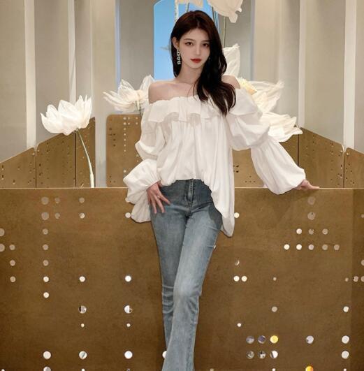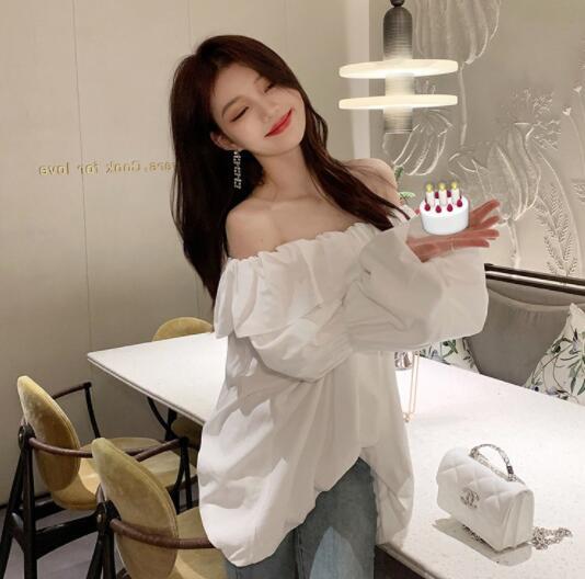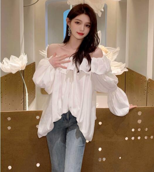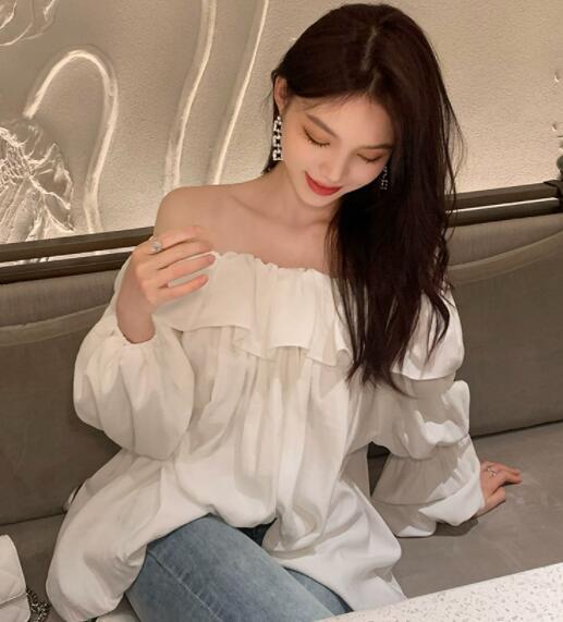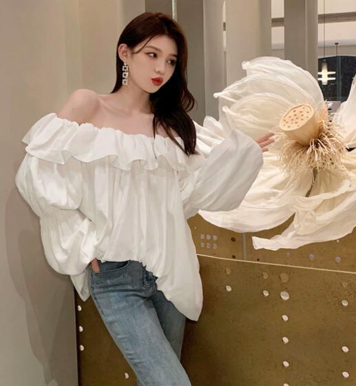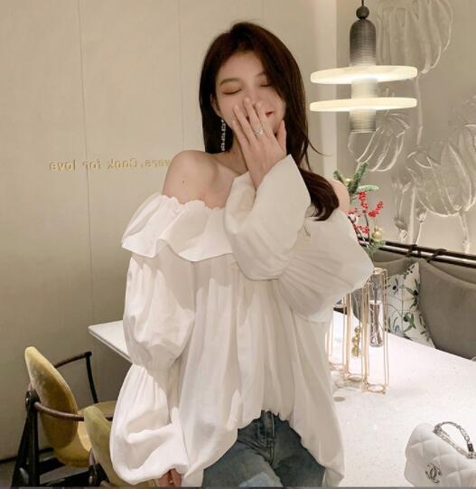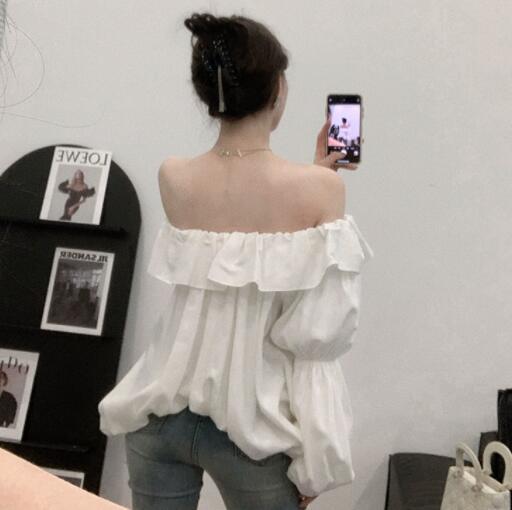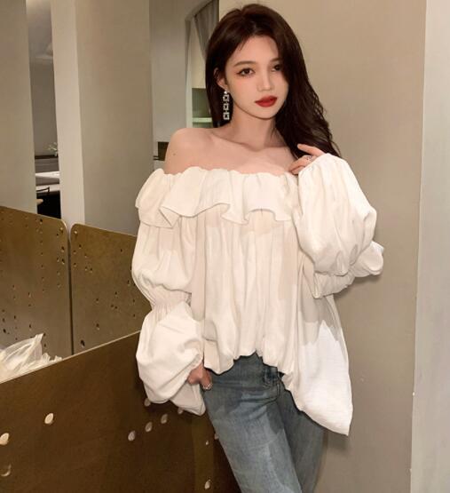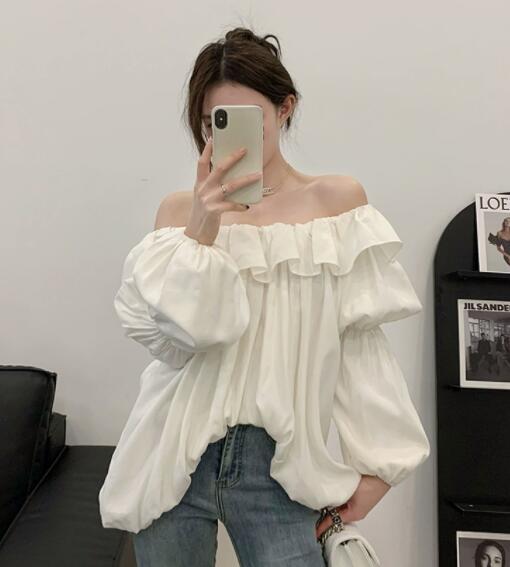 人気推薦トップス シャツ ブラウス 長袖 ランタンスリーブ フリル ガーリー かわいい オフショルダー ゆったり L ホワイト