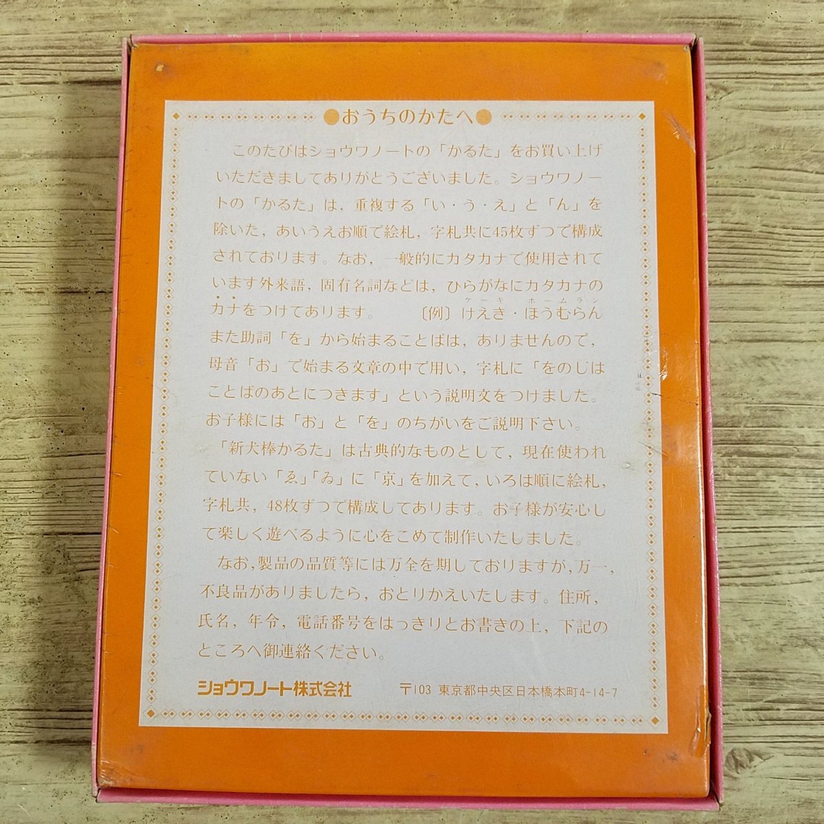 アニメ版・鉄人28号シリーズの3作目で、平成の時代に制作された「超電動ロボ 鉄人28号FX」のキャラクターを使ったカルタ。 読み句は、作品世界に沿ったものになっています。 【かるた 超電動ロボ 鉄人28号FX】 著者:--- 出版社:ショウワノート 発行年:?年?月?日 ?版 商品の状態:並下。使用感、経年変化、折れ、汚れ等がある。 (焼け少々 / 折れ少々 / キズ・破れあり / 汚れあり / ヨレ少々) 付属品: 備考: カルタはシュリンク未開封品です。 ただし、外箱やシュリンクなどに埃汚れが定着しています。また、箱には多少の破れ等があります。 #かるた #鉄人28号FX #鉄人28号 #ショウワノート #かるた・ショウワノート #懐かしアニメ #平成・アニメ 当商品は中古品です。 状態については、写真もよく参考にしてください。 商品の状態についてできる限り確認・記載しておりますが、見落としがあった場合はなにとぞご容赦ください。 |