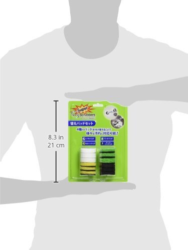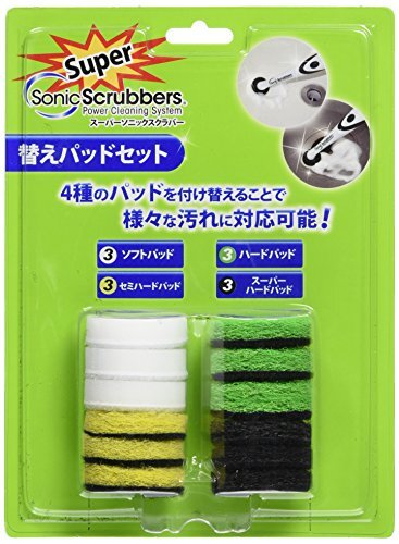 説明 商品紹介 電動お掃除ブラシ「スーパーソニックスクラバー」の替えパッドセット より ●軽量・コンパクト・防水仕様のハンディ電動お掃除ブラシ「スーパーソニックスクラバー」専用の替えブラシと替えパッドのセット ●専用パッド4種類(ソフト・セミハード・ハード・スーパーハード)が各3個入ったセット ●パッドは洗剤との相性がよく、広い面をらくらくお掃除できる ●プラスチック、ガラス、陶器、調理台、コンロ、フライパンなど、掃除する場所にあわせてパッドを変えることで、あらゆるお掃除に対応する ●注意書きをよく読んでご使用下さい。●電動ブラシ本体は別売りです。