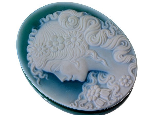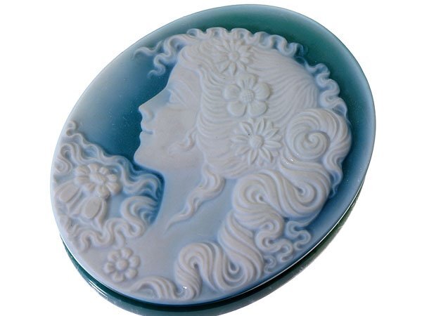 華やかな女性の横顔を繊細に彫刻で演出した、素晴らしい高級グリーンストーンカメオルースです!