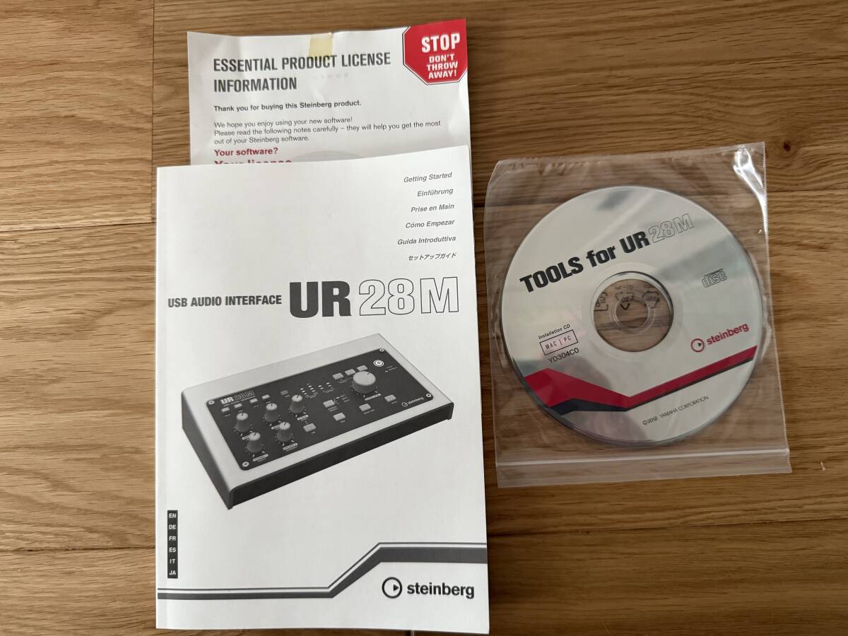 アダプター、取扱説明書、TOOLS for UR28M CD-ROM、ESSENTIAL PRODUCT LICENCE INFORMATIONカード(ライセンスが使用できるかどうかは関知いたしません)、Cubase AI DVD-ROM