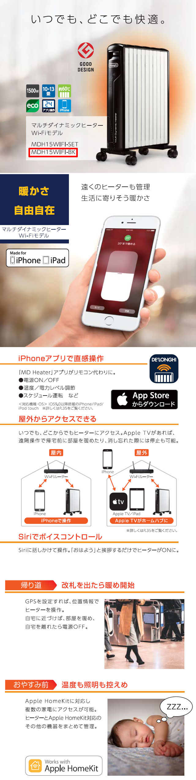 デロンギ マルチダイナミックヒーター MDH15WIFI-BK を出品いたします。 ■特徴■ 遠くのヒーターも管理 生活に寄りそう暖かさ iPhoneアプリで直感操作 「MD Heater」 アプリがリモコン代わりに。