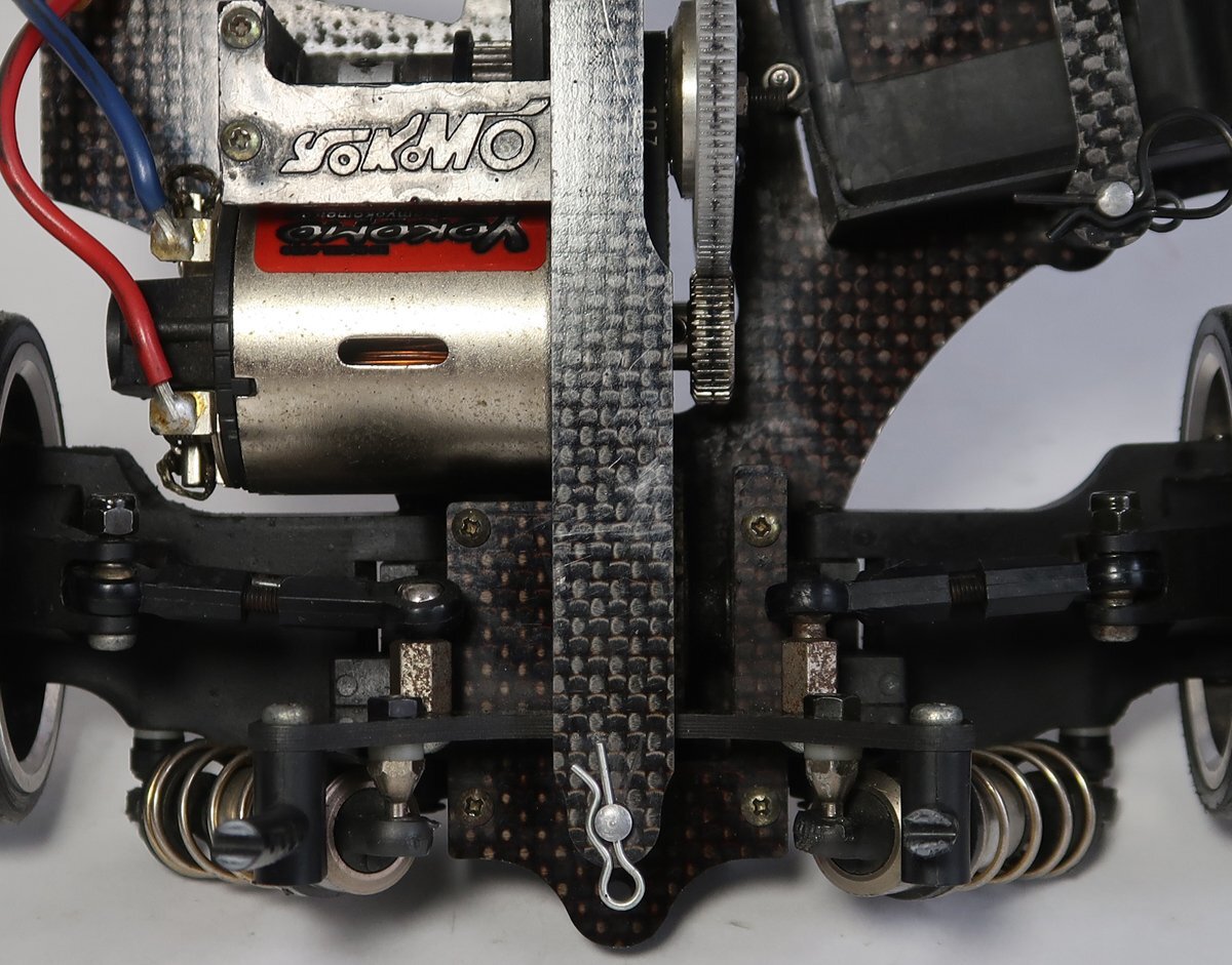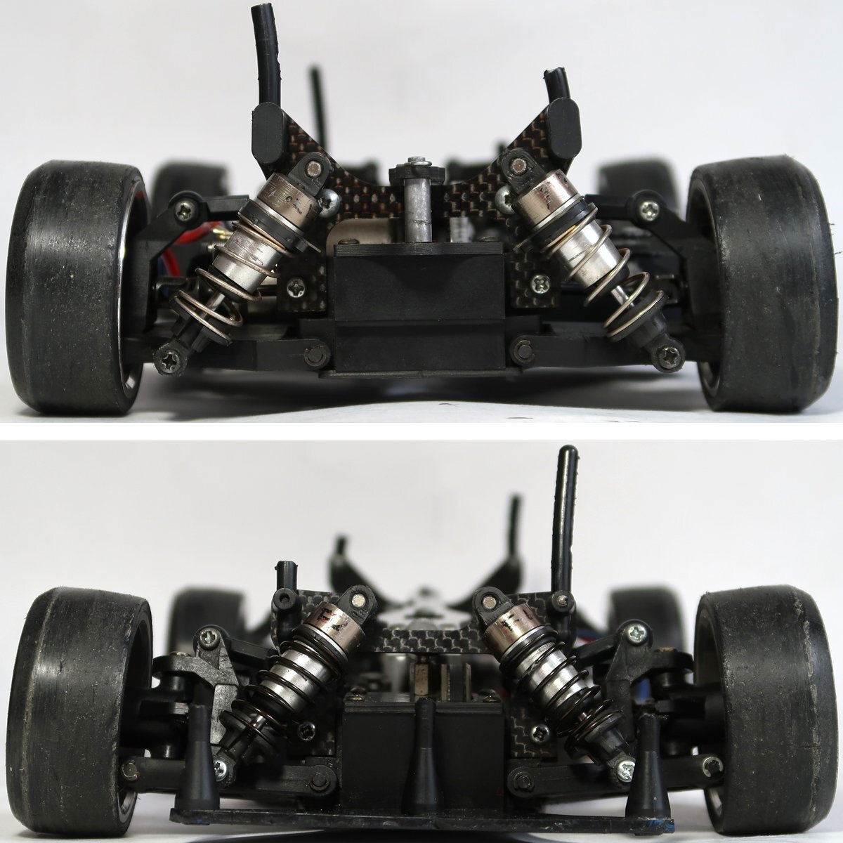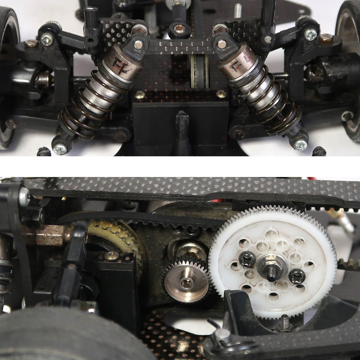 出品は画像の物が全てです。他に必要なものがあればご自分でご用意ください。ラジコンカーは使用品ですし古い物ですので所々に擦れや汚れがあります。擦り傷やサビもあります。ドリフトタイヤがつけられているので、おそらくドリフト仕様だと思われます。そのためかデフギアは逆回転させることは可能ですが、フロント、リアともかなり固められています。ダンパーはオイルは入っていない可能性があります。駆動系はベルトを引っ張ってみましたが、問題なく回転はしております。サスも動かしてみましたが、動作はしております。ボディ用のポールが折れてなくなっています。ひどいダメージはないと思われます。完璧に走行させる為にはメンテナンスが必要ですしプロポやバッテリー等の機器は必要です。簡単なクリーニングをしただけですので、一切の走行などの動作テストはしておりません。分かる事は以上です。お取引後は一切のサポートはしておりませんので問題があればご自分でご対処ください。お取り引き後に説明以外の不足品や説明以外の破損や故障が有ったとしても返品は出来ませんしクレームもお受けできません。問題があれば全てご自分でご対処ください。