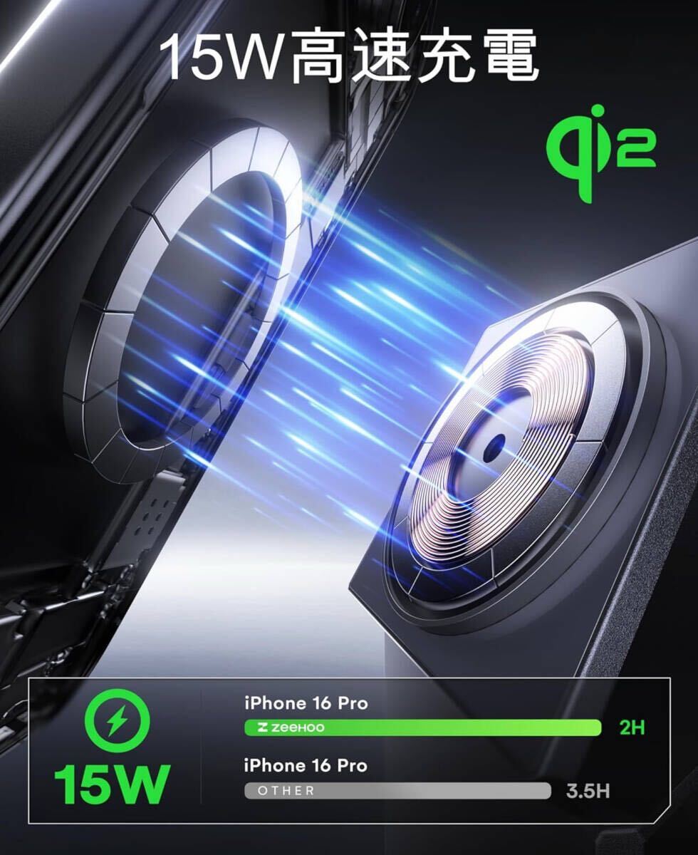 • Qi2 15W急速充電: ワイヤレス充電器として、急速充電を実現するQi2充電器を搭載。