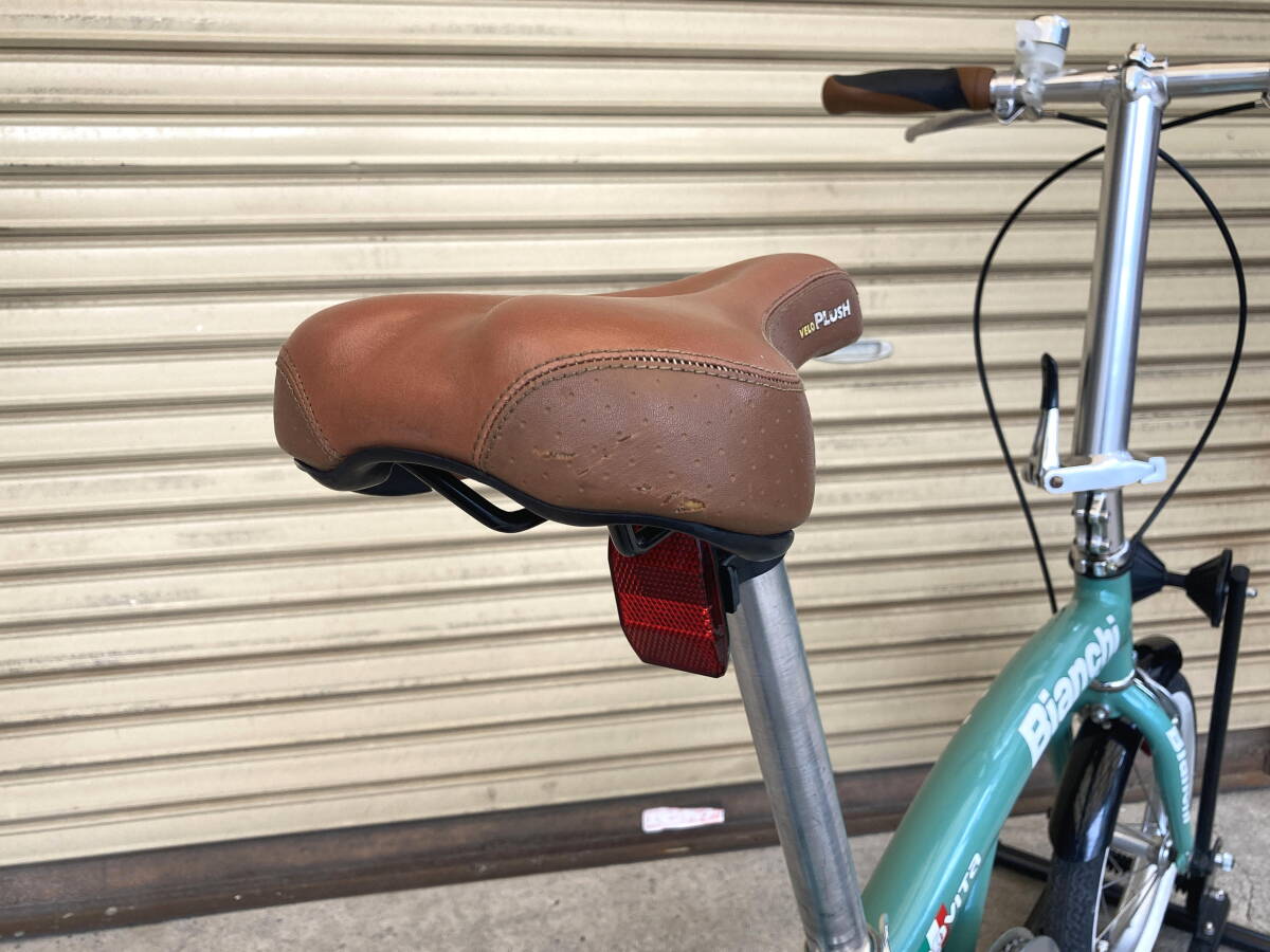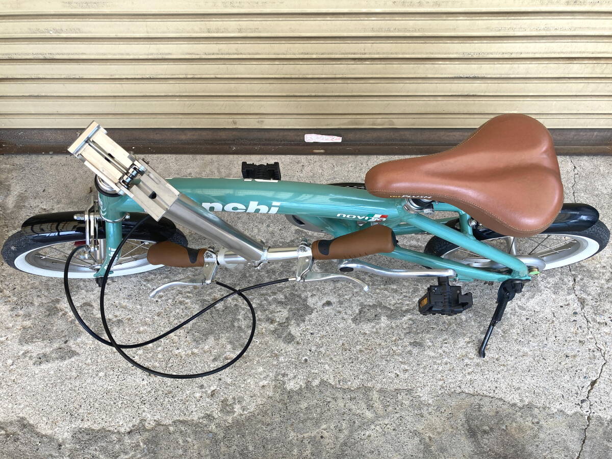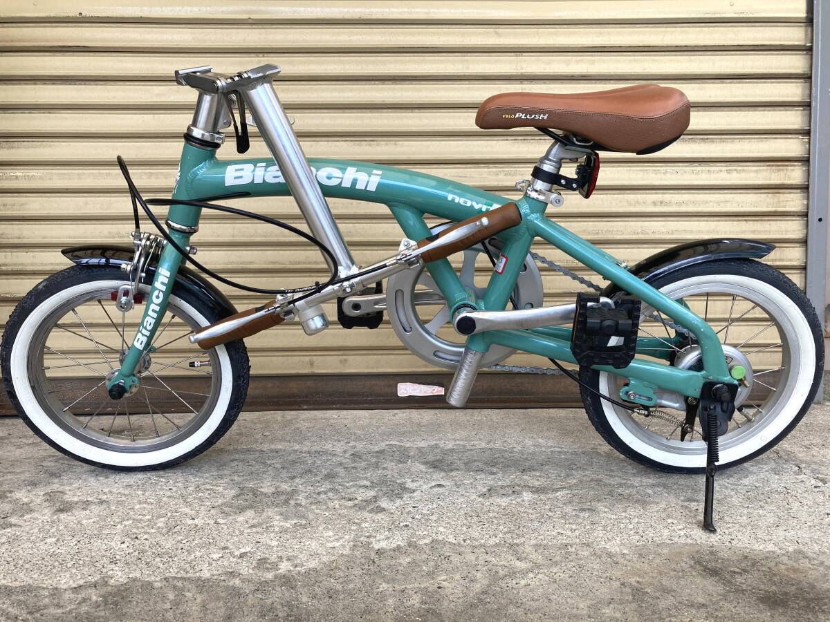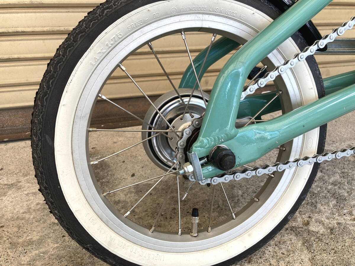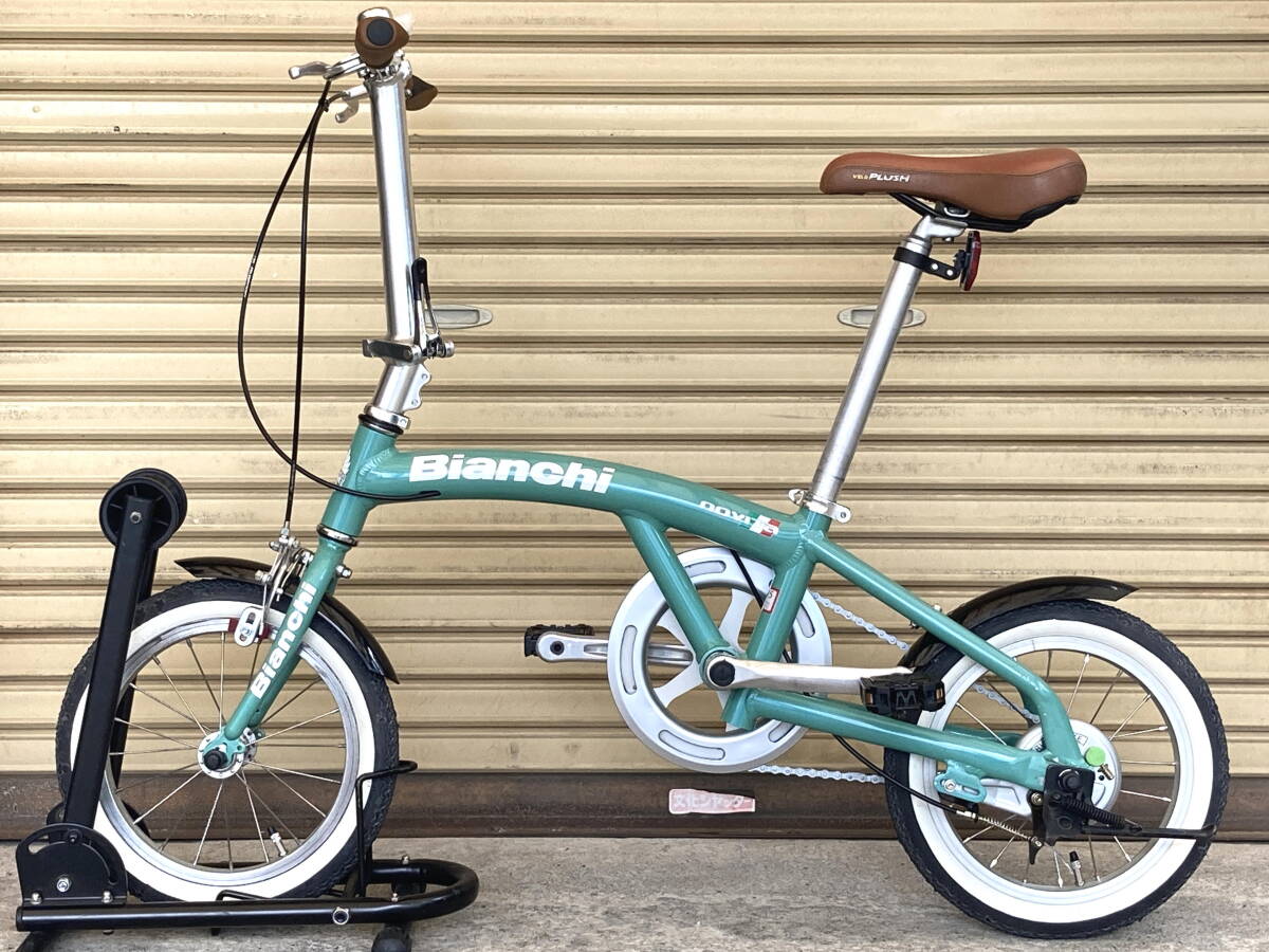 Bianchi ビアンキ novita ノビータ カラー:チェレステ アルミフレーム クロモリフォーク ホイールサイズ 14インチ wellgo 折りたたみペダル付属 画像1枚目・2枚目に写っているスタンドは付属いたしません。 数か所傷は有りますが、年式のわりに程度良い車体かと思います。 画像6枚目のチェーンリングガードに割れが有ります。(通常使用に支障はありません) 画像7枚目のサドル右後部に若干の破れが有ります。 前後タイヤ/チューブ・前後ブレーキワイヤー・フロントブレーキシュー・チェーン・グリップを新品に交換、 リアブレーキを純正のバンドブレーキから音鳴りしにくく制動力も良いサーボブレーキに変更。 画像5枚目 チェーンの張り調整がしやすいように、右側のみチェーンテンショナーを取り付け。 画像10枚目参照、リアホイールのスポークを左側の純正ラジアル組(スポークが交差しない)から、 右側のタンジェント組(スポークが交差する)へ変更して組直し、強度を確保しました。 14インチの小径車とはいえ、大人が乗るにはラジアル組では強度不足かと思いますので。 ヘッドライトは付属しておりません。夜間乗車される方はヘッドライトをご自身でご準備下さい。 上記のように整備済みですので、当分の間部品交換等の必要なくお乗りいただけると思います。 ただしあくまでも中古車になりますので、わずかな傷も気になる方は入札をお控え下さい。 下記引渡し方法にも記載しておりますが、店頭引渡しと宅配便発送に対応いたします。 発送の場合、ハンドルポストを折りたたみサドルを下げ、右側ペダルを外し梱包いたします。 ペダル取付け用のペダルレンチ(15mmスパナ)か6mmの六角レンチが必要になります。 最低限の工具と多少の知識が必要になる事をご了承の上、落札・発送ご依頼下さい。 防犯登録ご希望の場合、当方で神奈川県での登録(全国有効)別途 700円も出来ますし、 販売証明書を発行して落札者様ご自身で近所の登録所で登録する事も出来ます。 落札後にご希望をお知らせ下さい。 発送・引渡し後のクレーム・返品は一切お受け出来ません。 記載以外の事で不明点等ございましたら、質問等よりお問い合わせ下さい。 以上ご理解いただき、下記注意事項等もお読みいただいた上、ご納得いただいた方のみ入札をお願いいたします。 |