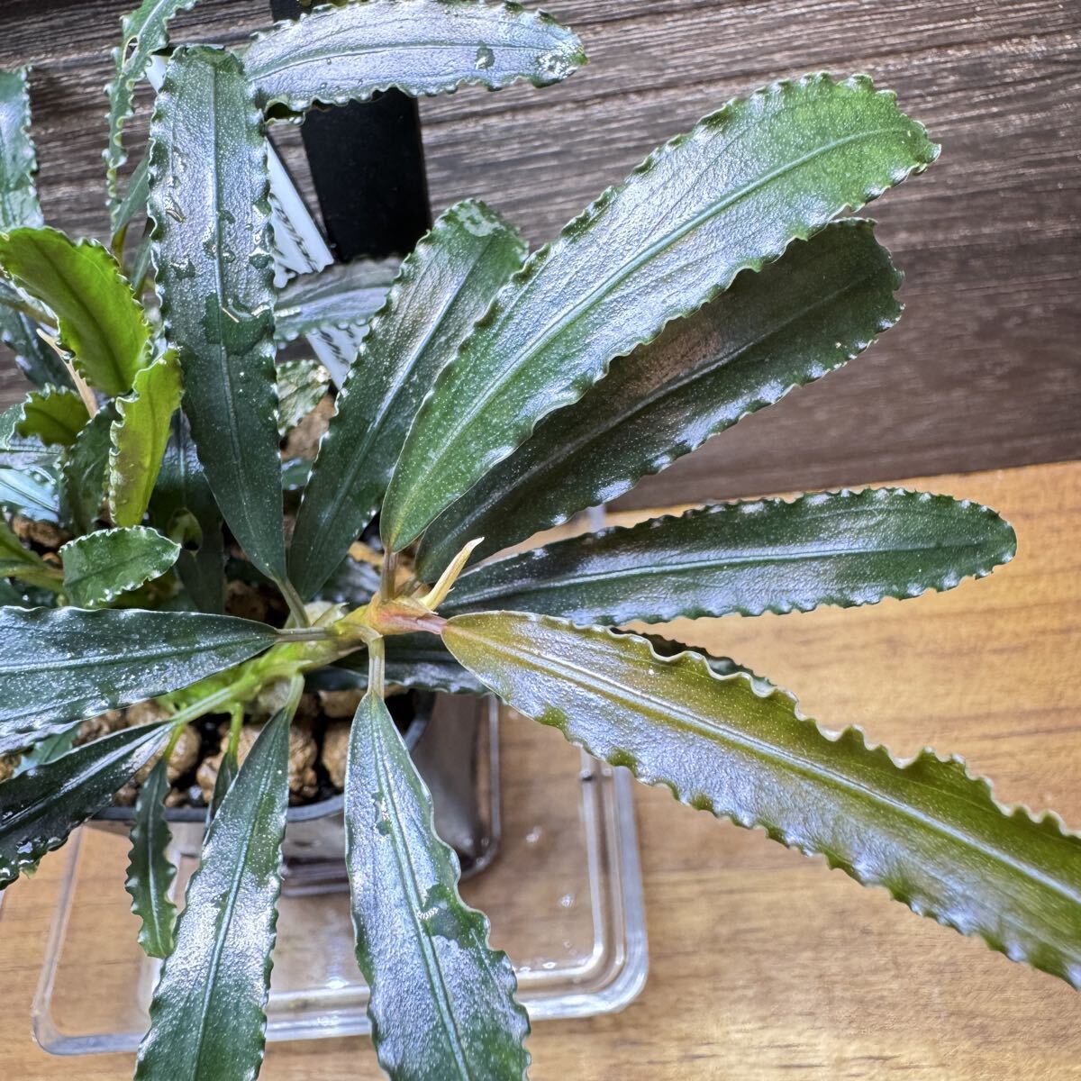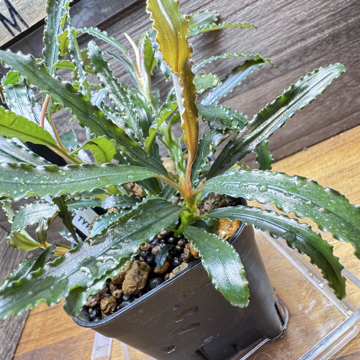 ◆ 【水上】で育成した株になります。湿度低めで育成。水中葉では銀を散りばめた様な発色を見せ、水上葉になるとダークな葉に変化。銀ラメの名残は深みのある色と艶を見せてくれます。葉の縁は強めのウェーブがかかり、少し匍匐しながら成長していきます。