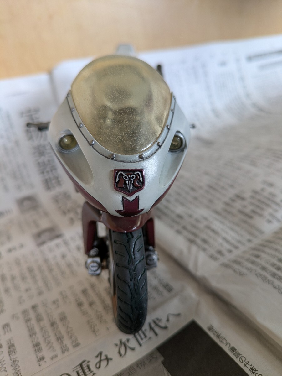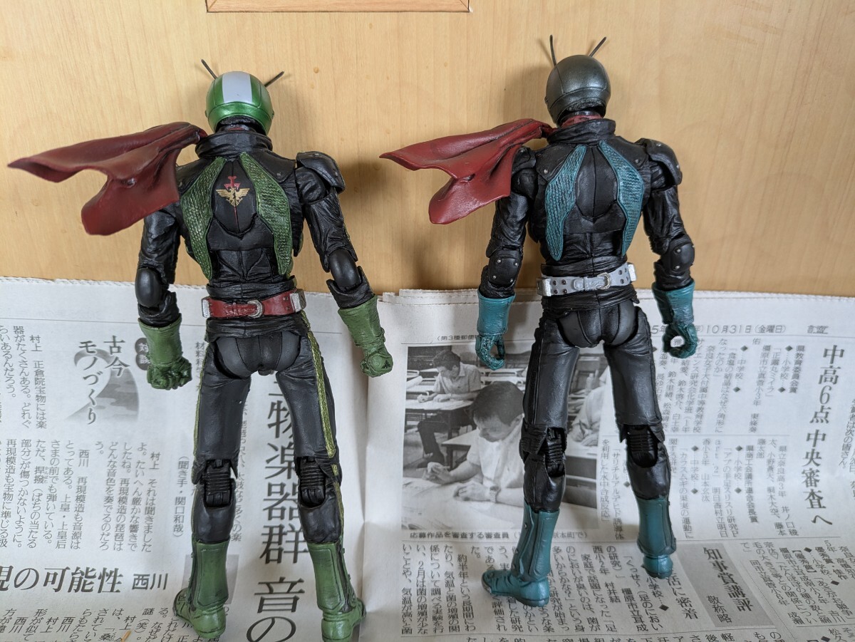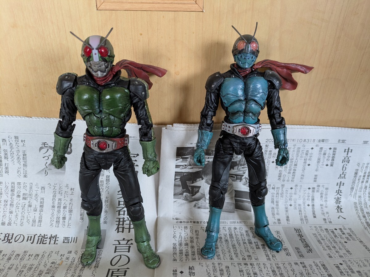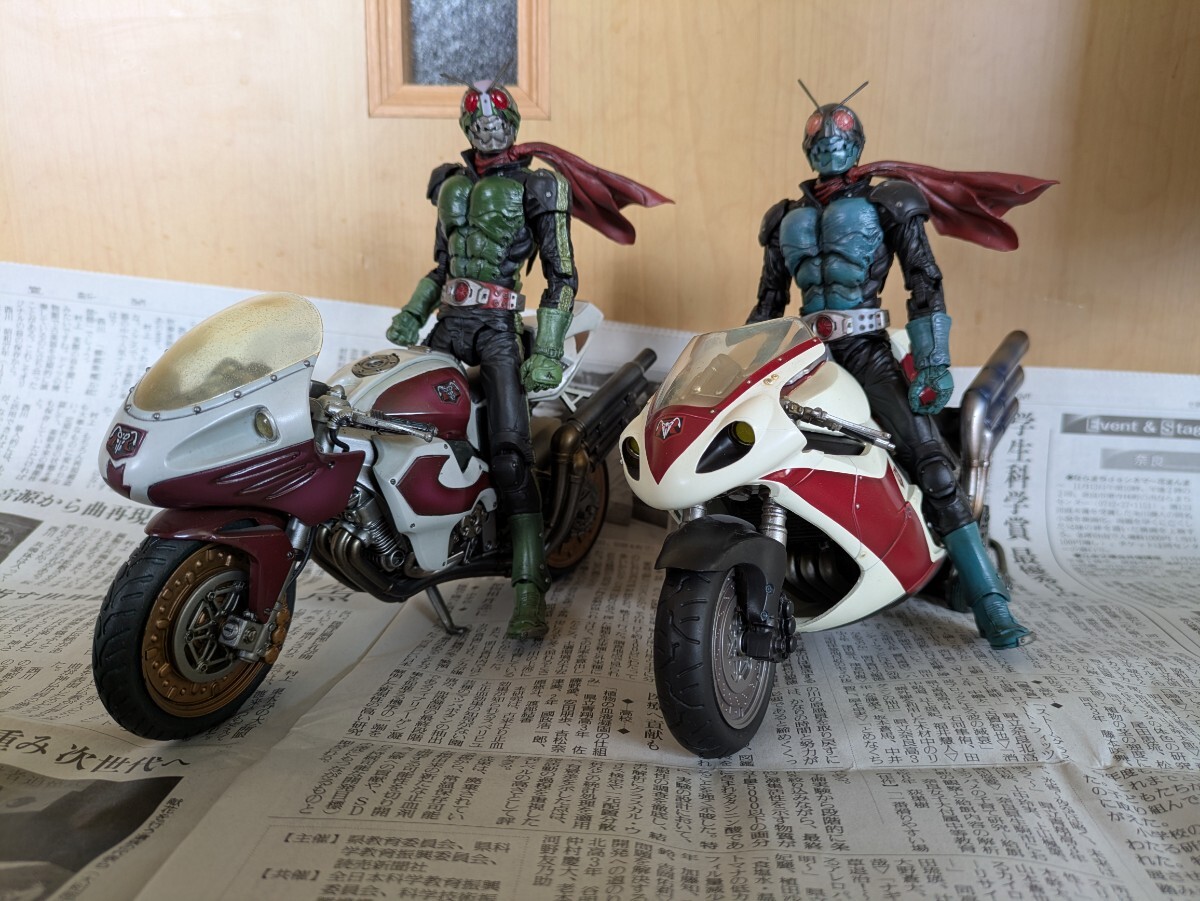 仮面ライダーはMOVIERealizationの2体。1号乗車のサイクロン号はs.i.cシリーズtheFirstの物。2号乗車の新サイクロン号は以前ヤフオクで購入した完成品ですがスタンドがやや短いためか倒れやすいです。ガラスケースで飾っていました。画像にあるものが全てです。