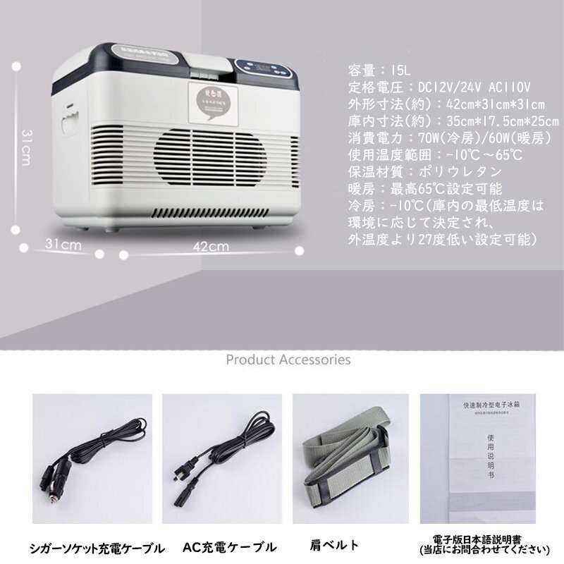 パッケージ内容:15L車載冷蔵庫本体、AC電源ケーブル、シガーソケット電源ケーブル、肩ベルト、日本語説明書。