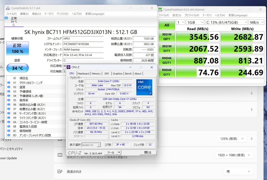 | CPU: 超高速 Intel 10コア 卓越性能 第12世代Core i7-1255u 1.7Ghz、 10コア12スレッド (ターボ・ブースト利用時の最大周波数 4.7GHz) |