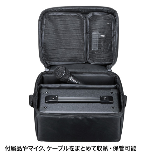※配送の送り主はサンワサプライ(株)と記載されています。沖縄・離島配送不可となります。 当店は正規販売代理店です。 特長 講義や講演、小規模な会議場やイベントなどに手軽に持ち込み、簡単にセッティングができる拡声器スピーカーとマイクのセットです。 ワイヤレスマイク1本同梱。 ワイヤレスマイクはB型帯域に割当てられた10波の中から1波を選択して利用できるので周波数が重なった場合も手軽に変更が可能です。 有線マイク入力端子も2系統搭載しており、サンワサプライ製ダイナミックマイク(MM-SPHM1・別売)を接続することでワイヤレスマイクと有線マイクを同時に使用することもできます。 ※ワイヤレスマイクとマイク入力1(有線)は同時使用はできません。ワイヤレスマイクとマイク入力2(有線)の同時使用は可能です。 またはマイク入力1(有線)とマイク入力2(有線)の同時使用は可能です。 標準的なマイク入力端子(6.3mm)を2系統搭載しています。 スピーカーは約120~150平方メートル程度での使用に最適です。 メーカー保証期間180日 ※当店発注日からになります 気をつけておりますが、タイミングによっては在庫切れの場合があります。 一体型スピーカーなので電源を接続し、マイクを接続するだけで使用できます。 外部音声入力を搭載しており、音楽再生も可能です。同時にマイク音声出力もできます。カラオケスピーカーとして利用したり、結婚式の2次会やパーティーなどにバックミュージックと共にアナウンスを流したりできます。 電源は通常の家庭用コンセントで使用できるAC電源と持ち運び時も使える電池駆動(単三乾電池×6本使用)の2WAYに対応しています。 本体下部には一眼レフカメラ用三脚が取り付けできる三脚ネジ穴(UNC1/4インチ)を搭載しています。三脚を取り付けてスタンド付きスピーカーとして使用することもできます。 ※ 耐荷重3.5kg以上の三脚をご使用ください。サンワサプライ製スピーカースタンド(MM-SPST1)が対応します。 持ち運びに便利なハンドルを装備しています。 付属品やマイク、ケーブルをまとめて収納・保管できる専用バッグを付属しています。 <ワイヤレスマイク部> 特定小電力無線局ラジオマイク(800MHz帯)規格に適合したワイヤレスマイクです。 B型帯域を使用しており10波の中から1波を選択して利用できます。 発言者の声色をできるだけ忠実に引き出すワイヤレスダイナミックマイクです。 仕様