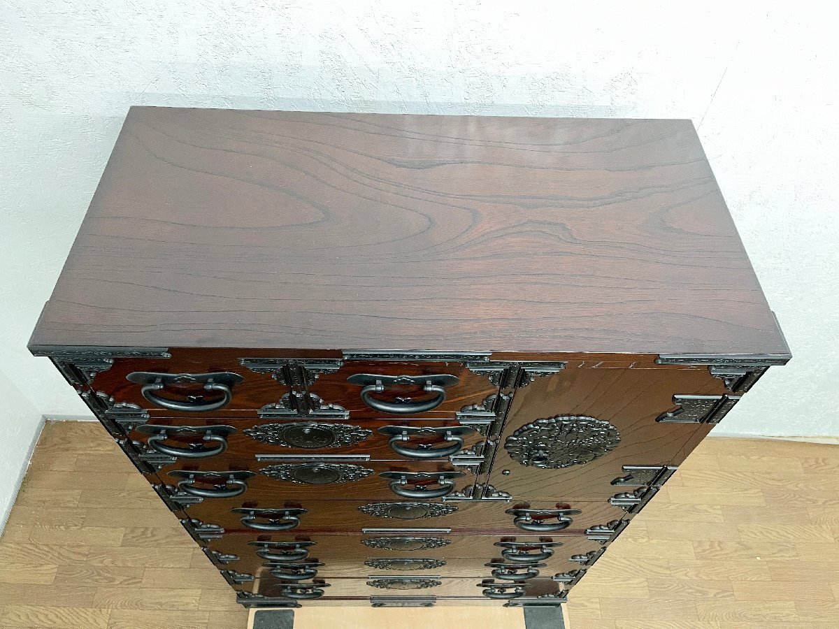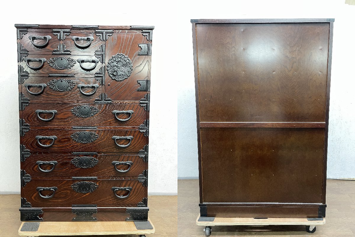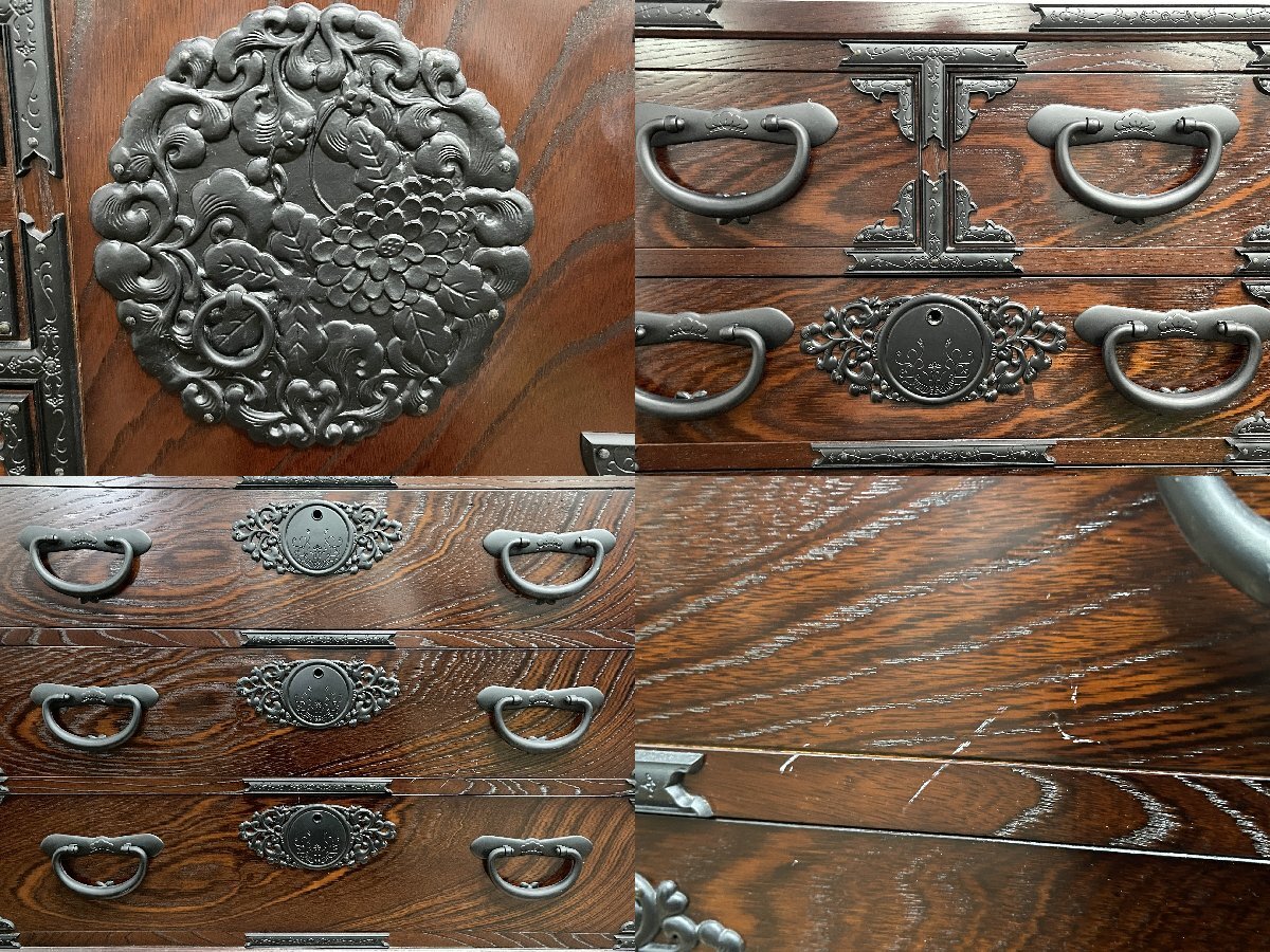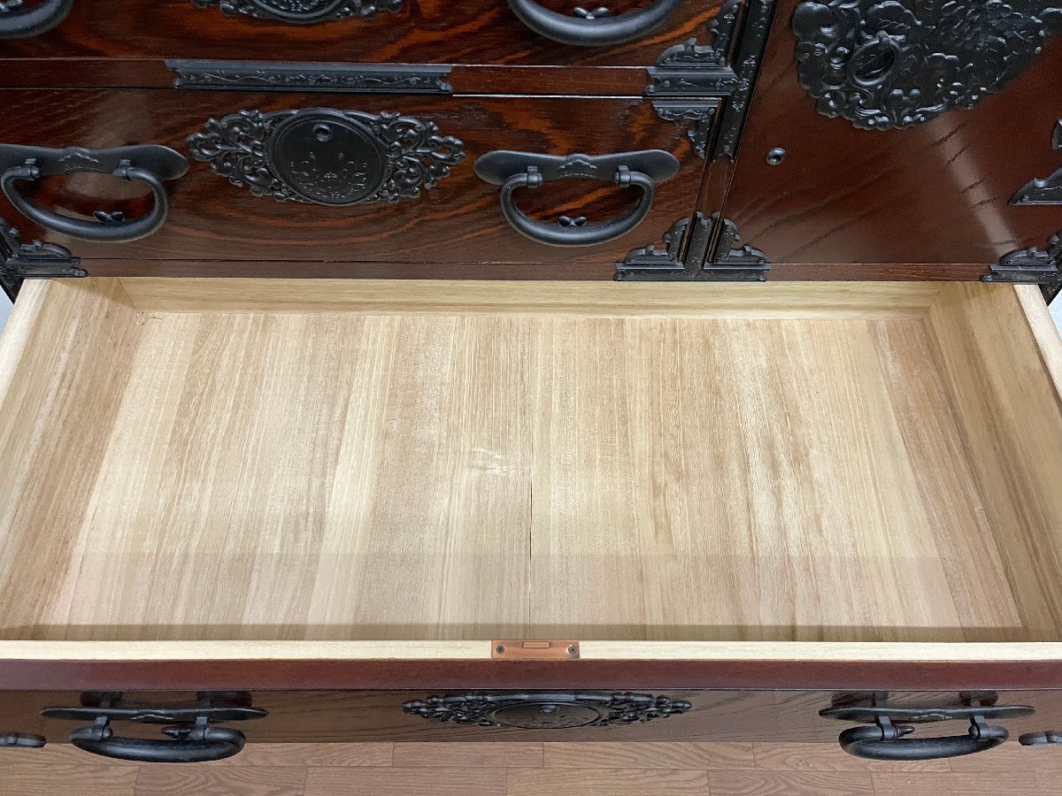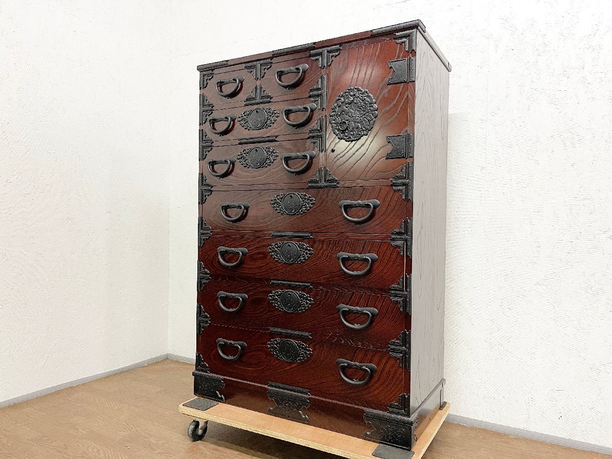 状態説明 重厚な木目と金具の装飾が美しい、民芸調の和箪笥です。