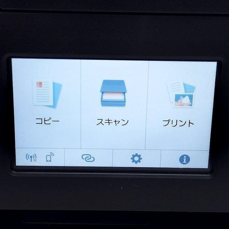 電源を入れると「インクタンクが認識できません」と表示され、スキップすると「コピー」「スキャン」「プリント」が表示されます。