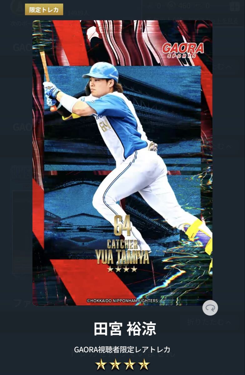ファイターズトレカ GAORA視聴者限定レアトレカ★4 田宮 裕涼選手/秋季キャンプ 11/30まで入力可能