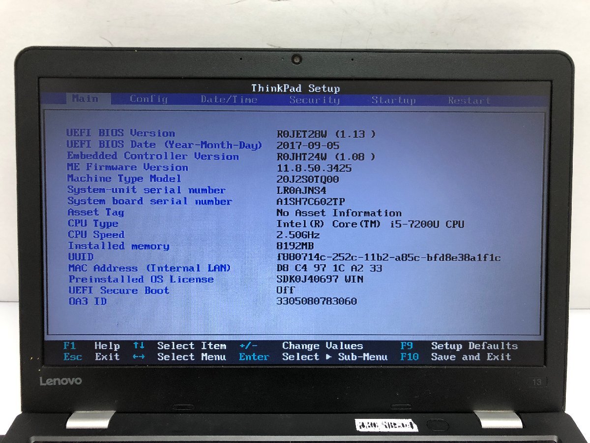 ジャンク/ LENOVO 20J2S0TQ00 ThinkPad 13 2nd Gen Intel Core i5-7200U メモリ8.19GB SSD256.06GB 【K21188】