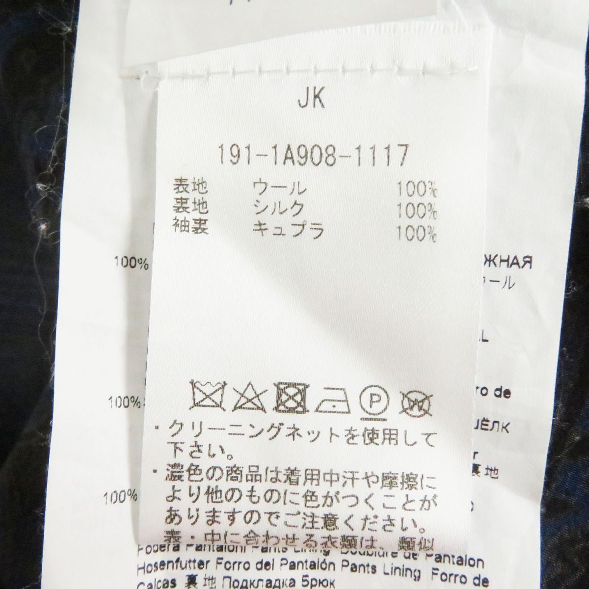 | 素材 (material) | 表地:ウール100% 裏地:シルク100% 袖裏地:キュプラ100% パンツ 表地:ウール100% 裏地レーヨン100% | ||||||||||||||||
