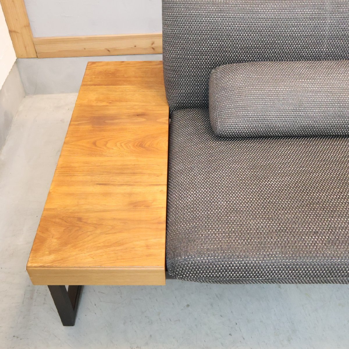 広めのアームはサイドテーブルとしても機能し、カップや雑誌、クッションを置いたりと