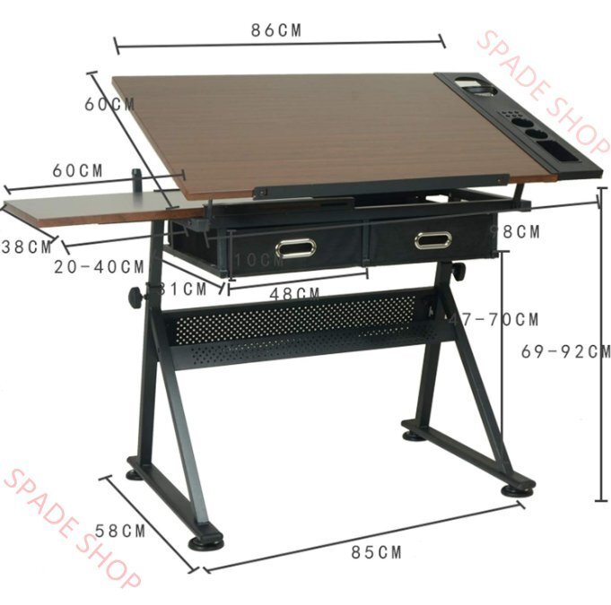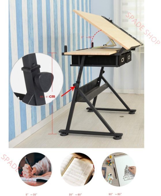 *高さと角度の調整可能:高さは69から92cmまで調整可能。完璧な描画位置のために0度から80度まで角度を調整できます。全体寸法:98 x 58 x 69-92cm、テーブル表面:86 x 60cm、引き出し2個48 x 31cm