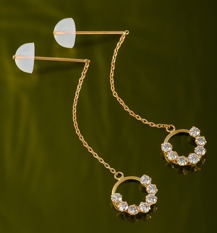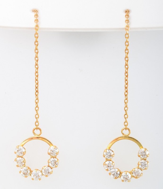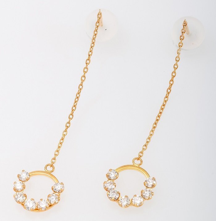| 説明 | サークル状のイエローゴールド(18金)の枠にダイヤモンド(方耳0.20ct、両耳合計0.40ct)がセットされ、長めのチェーンに垂れ下がるスイングピアスです。 全てのスタイルにフィットするデザインです。 |
