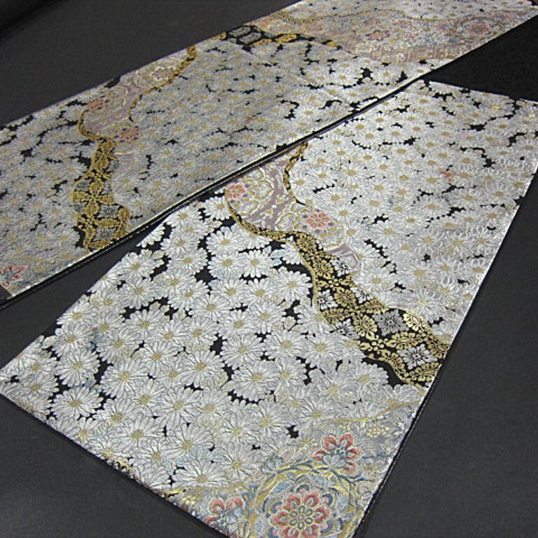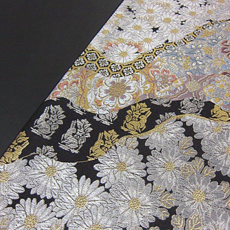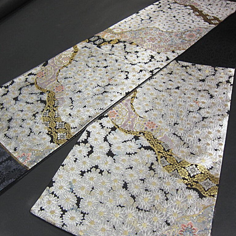 新品未仕立  西陣織六通柄袋帯 壱阡八百織 三重綾織 福寿帯 千寿菊花文です。 『福寿草と呼ばれるこの花は、古来、日本では長い冬の終わりをを告げ、春の到来をいち早く知らせる花として日本人の心を潤してきました。別名【元日草】【長寿菊】と呼ばれ新年を寿ぐ花又祝儀の花として愛でられ正月の床の間に欠かせないものです。また、ギリシャ神話では美少年アドニスの血から生まれたとされ、アイヌの伝説では、天界の美しい女神クノウの化身と伝えられています。そういった神秘的でまた目出たい花を帯のデザインに取り入れ長寿と幸福を願い創作いたしました。新年の晴着に。祝儀の席など、いろいろな場所に締めて頂ければ幸いです』