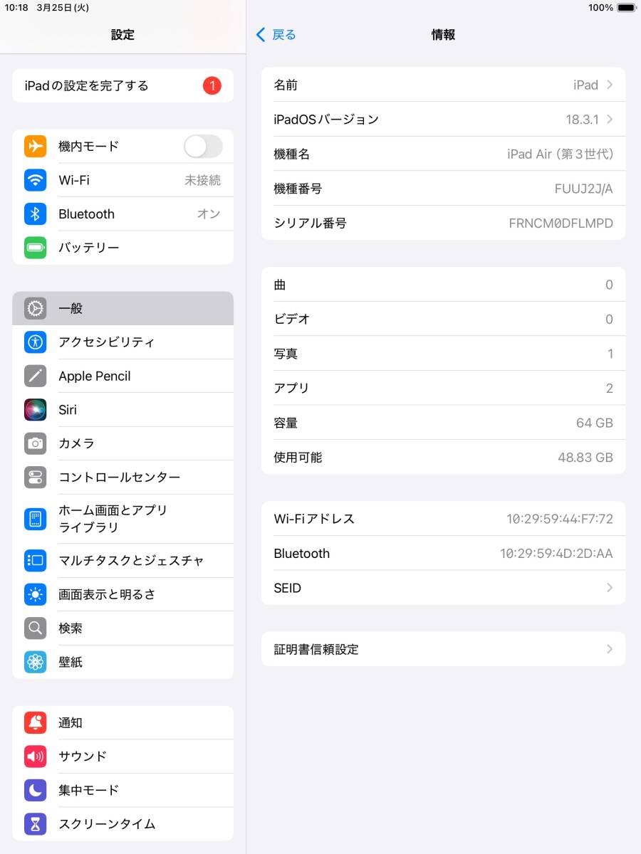 Apple iPad Air 第3世代 Wi-Fiモデル 64GB スペースグレイ 10.5インチ A2152 動作確認済み 初期化済み
