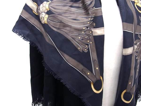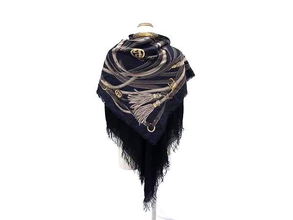 1円 ■美品■ GUCCI グッチ GG柄 シルク100% ベルト柄 大判 スカーフ ストール ショール レディース ブラック系×ネイビー系 FU6654