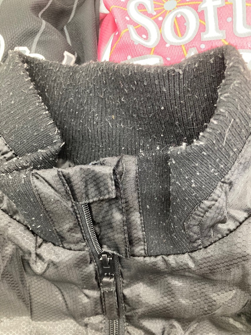 ジャケットに毛玉があり、ユニフォームに汚れが見られます。