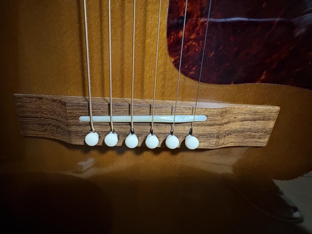 プロの工房にてアコギのサウンドの要である牛骨サドルと牛骨ナットをビンテージボーンでオーダー製作し、各部調整済みでネックはストレート、弦高2.5ミリと2ミリほどにセッティング済みで抜群の弾きやすさです。 フレットもほとんど減っていません。