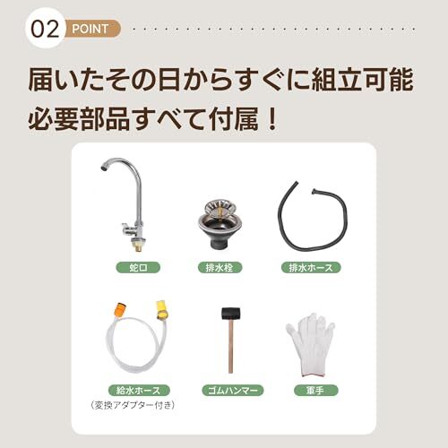 【商品仕様】◆全体サイズ:幅83×奥行84.5×高さ109.5cm ◆槽サイズ:幅38×奥行32×高さ15cm ◆梱包サイズ:幅88×奥行50×高さ30cm ◆本体重量:約15.7kg ◆梱包重量:約17.7kg ◆付属物:蛇口、排水栓、排水ホース、給水ホース、ゴムハンマー、軍手。