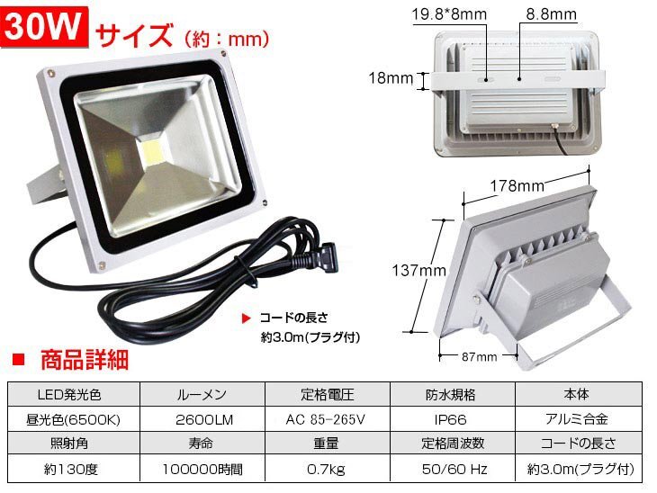 ◆LED採用の省エネ投光器ライト: 30Wと省電力で、従来の300W相当の明るさです!IP66規格の防水仕様!屋内·屋外両方ご利用OK!また倉庫用の照明·集魚灯·看板灯など用途は様々! ◆カバーは強化ガラス: 普通のガラスの4~5倍の強度を持つ強化ガラスを採用、光線の透過率は大幅アップします。透過率は98%以上に達する! ◆放熱性のいいアルミ合金: アルマイト処理のアルミ採用することで、放熱性を更なる段階に引き上げ!耐熱範囲内の正常な働きを保ちます。 ◆角度調整可能: ライトは柔軟な角度調整機能を持ってます。使い方も非常にカンタン! ◆驚きの長寿命: 本製品は100000時間以上の長寿命で、他の商品の2000時間を遥かに凌駕します。 ◆ファッションの設計: アルミ合金のボディ、グレーの外観は高級感が持ってます。 ◆広い使用範囲: トンネル、掲示板、ガソリンスタンド、夜間作業、現場工事、駐車場、公園、運動場にも様々な場所で活躍します!公園、運動、屋外や現場作業にも便利です!特に、夕暮れ時夜間作業にとても役立ちます! 虫が集まりにくいの も魅力です。 【保証】 ◆当商品は12っヶ月保証となります。 ◆お届けから1週間以内にご連絡のあった不良品の保証対応の送料は当方が負担いたします。 ◆保証期間内の不良品ですが、交換のみ対応しております。往復送料はお客様負担となります。在庫がない時だけ返金しますので、ご了承ください。 |