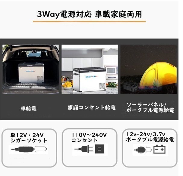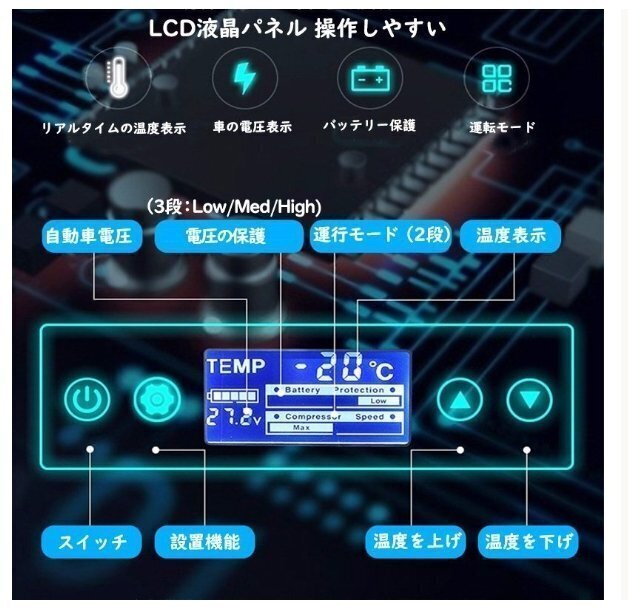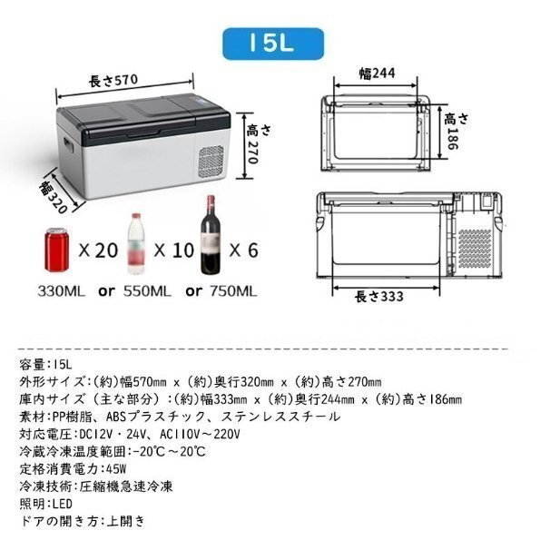 【40分で-20℃まで】①家庭用冷蔵庫と同じ、コンプレッサー式のポータブル冷蔵庫なので、-20℃~20℃調整でき、40分で25℃から-20℃まで冷却でき、冷却が速いです(環境温度が25℃、空の状態でテストした結果)。②冷却部品が内壁四面を包んでおり、四面からも冷却できます。③磁気蓋を採用され、冷気が漏れません。電源を切れても数時間保温できます。 【15L大容量】550mlのペットボトルが縦に入ります(高さが270mmまで)。330ml缶が約20本、550mlペットボトルが縦に約10本、750mlワインボトルが約6本入ります。台風、災害、緊急時の防災グッズとしても大変役立になります。車載冷蔵庫の外寸は57*32*27cmで、内寸は33.3*24.4*18.6cmです。 【4Way電源対応】①車12V・24Vシガーソケット、家庭110V~220Vコンセントに対応でき、車中泊だけではなく、業務用、家庭サブ冷蔵庫としてもご利用いただけます。専用バッテリーから冷蔵庫を給電と同時に、ソーラーパネル(別売り)がバッテリーを給電できます。電気代を効果的に節約できます。②低電圧保護機能搭載、3段階調節でき、車バッテリーの電圧が不足になると、コンプレッサーが自動で止まります。バッテリー上がりの心配がないのでアウトドアでは安心に使用できます。 【放熱・静音機能つき】①新しいタイプのファンを使い、放熱機能が一層に強くなります。耐用性が優れて、長時間運転中でも冷蔵庫の発熱に心配する必要はありません。②冷蔵庫が稼働中、コンプレッサーから1メートルのところではただ40dBほどのノイズが聞こえます。コンプレッサーが稼働中止すると、ほとんど騒音がなくて、車中泊時の夜間で安眠できます。 【耐震補強設計】車載冷蔵庫本体が30°傾斜しても安定に動作可能です。車の振動と揺れでトラブルが発生する心配が一切ありません! 【商品の説明】 商品状態:未使用 カラー:グレー 定格電圧:DC12V / 24V、AC110-220V 定格出力:45W 本体寸法(外):幅570mm*奥行320mm*高さ270mm 本体寸法(内):幅333mm*奥行244mm*高さ186mm 本体重量:11.8kg 設定温度:-20℃~20℃ 低騒音:40dB 表面材質:PP樹脂、ABSプラスチック、ステンレススチール 梱包内容:15L車載冷蔵庫本体x1、AC電源コードx1、DC電源コードx1、取扱説明書x1