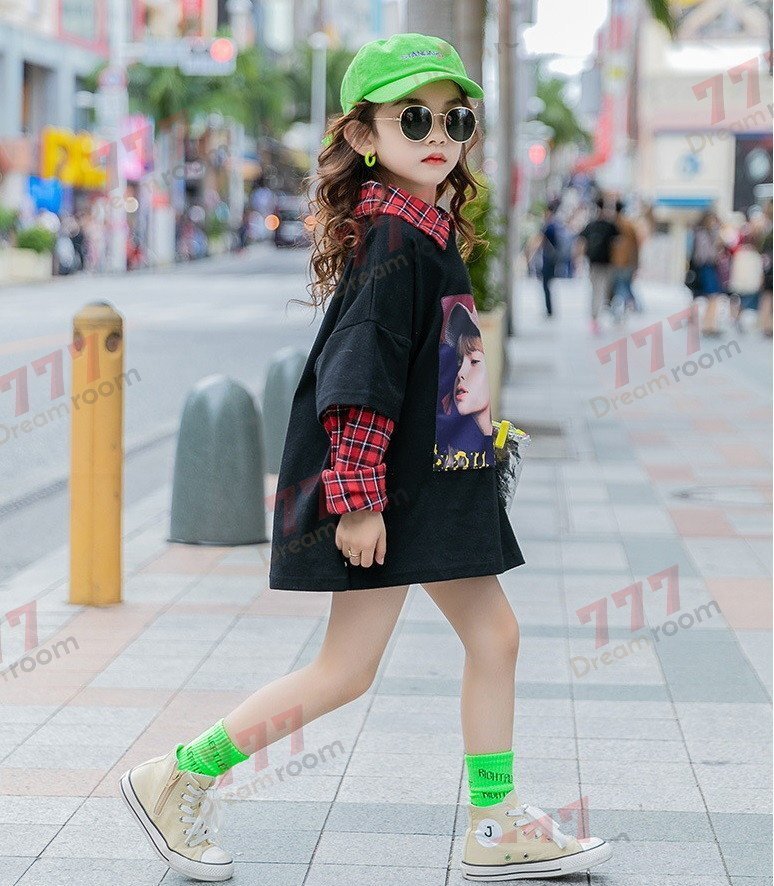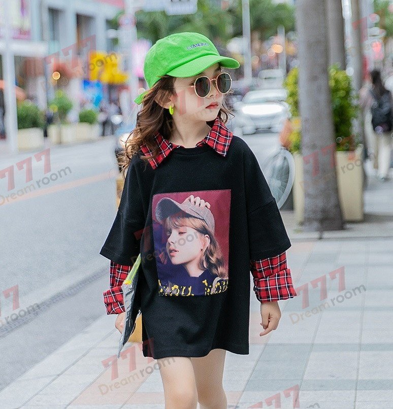 1スタ☆kids タータンチェック シャツ重ね着風 トップス 【170cm】ブラック 女の子 ロンT 学生 秋服 長袖 K-418bk