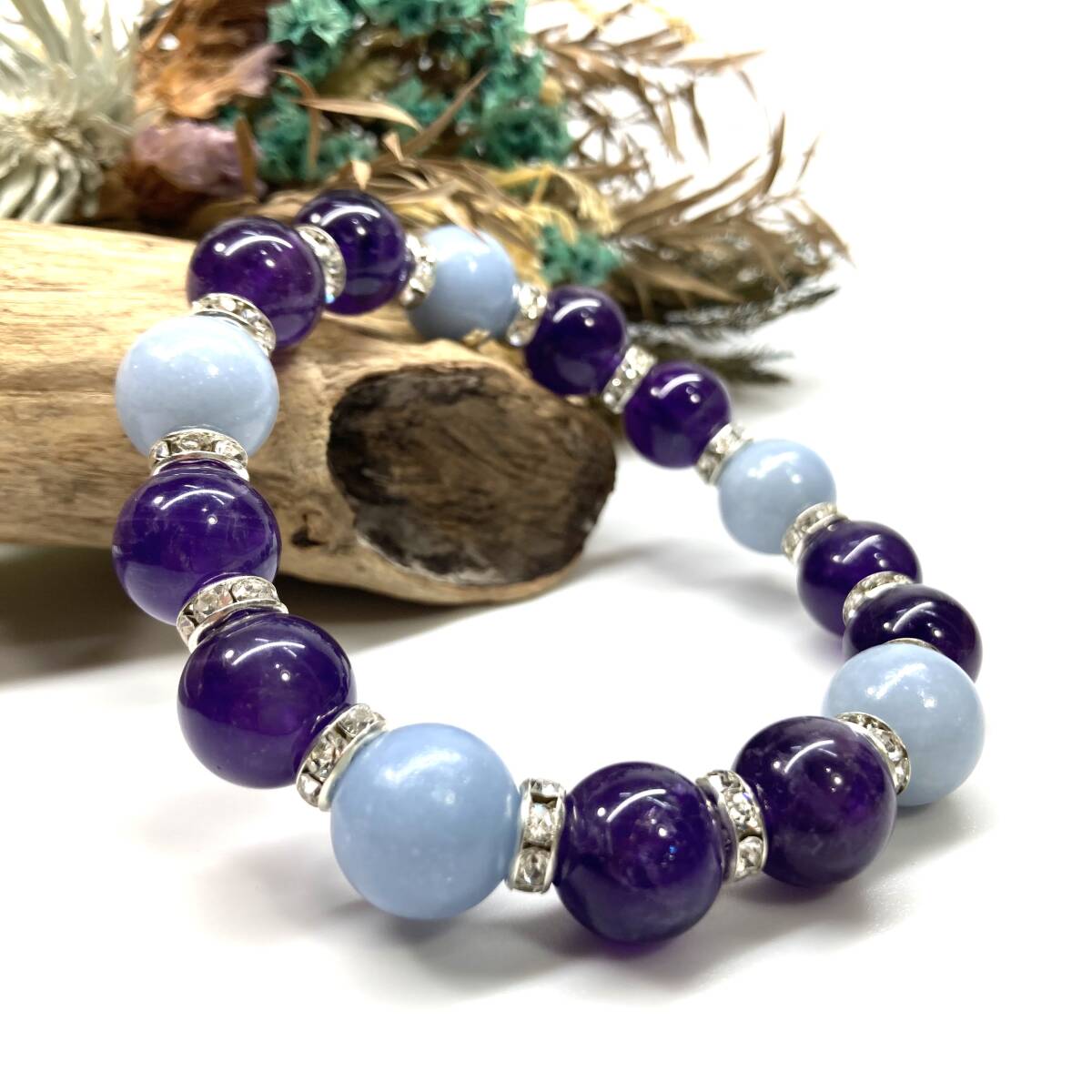 こちらは、エンジェライトとアメジストを組み合わせたパワーストーンブレスレットです。間にはロンデルを挟み高級感あるデザインに仕上げております。石大きさは12mm玉を使用して内周約18cmです。気になる方は是非この機会にどうぞ。