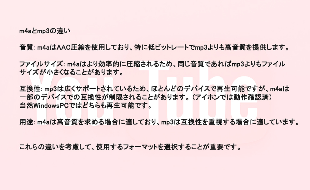 YouTube動画より音声のみを抽出する機能(m4aファイル、mp3ファイル)がございます。