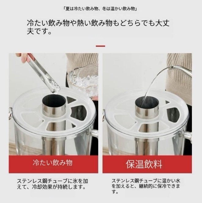 【耐久性のある構造】蛇口付きジュース飲料ディスペンサーはガラス製で、頻繁な使用に耐えるように作られており、ケータリング、レストラン、または家庭での使用での摩耗や損傷に対処できます。ステンレスチューブを使用し、自由に取り付け、取り外しができるジュースディスペンサーです。このチューブは最大 1 リットルまで入れることができ、たとえば角氷を入れることができるため、飲み物の温度を最適に制御することが容易になります。