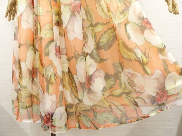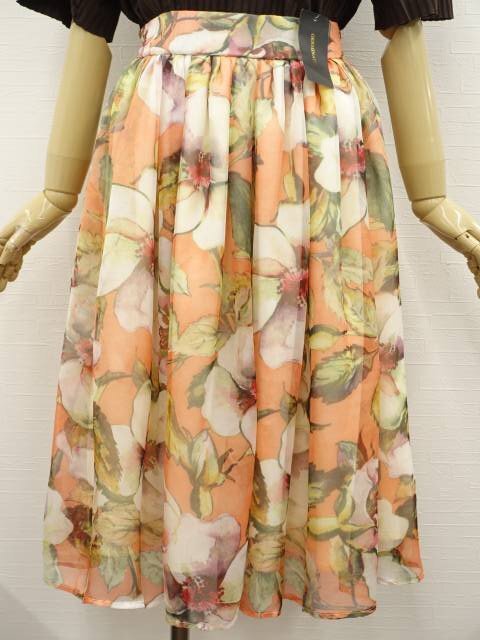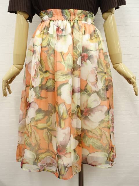 洗える ロング丈 シフォンギャザーフレアスカート M オレンジ地 アイボリー×レッド×グリーン 花柄