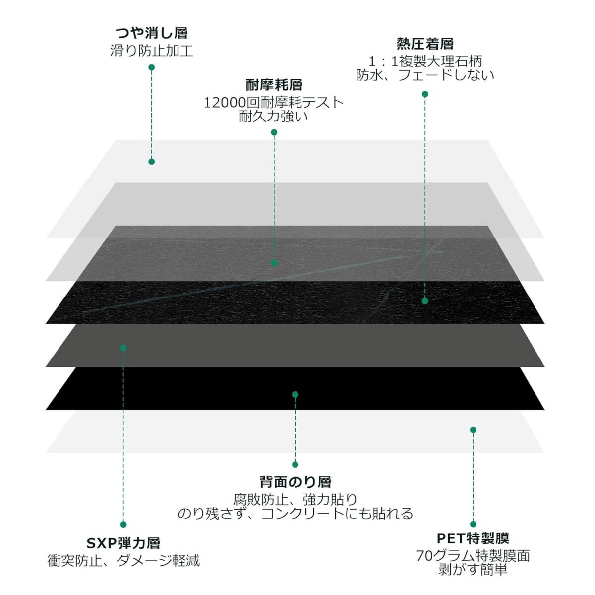 エンボス加工によるリアルな大理石調の質感が特徴のフロアタイルです。