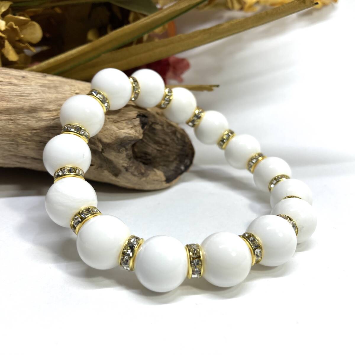こちらは、12mm玉のホワイトオニキスを使用した天然石ブレスレットです。石との間にはロンデルを挟み高級感を演出しています。シンプルなデザインですのでどんなコーディネートとも合わせ易いブレスレットです。石大きさは12mm玉です。内周約18cmです。(サイズ変更の場合は取引ナビにてご連絡をお願いします。) 数に限りがございますので気になる方はお早めにどうぞ。