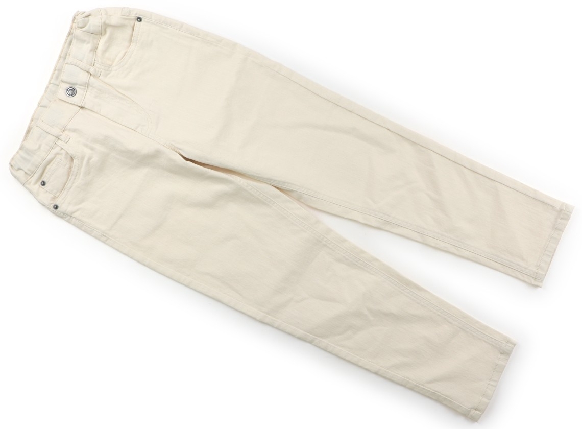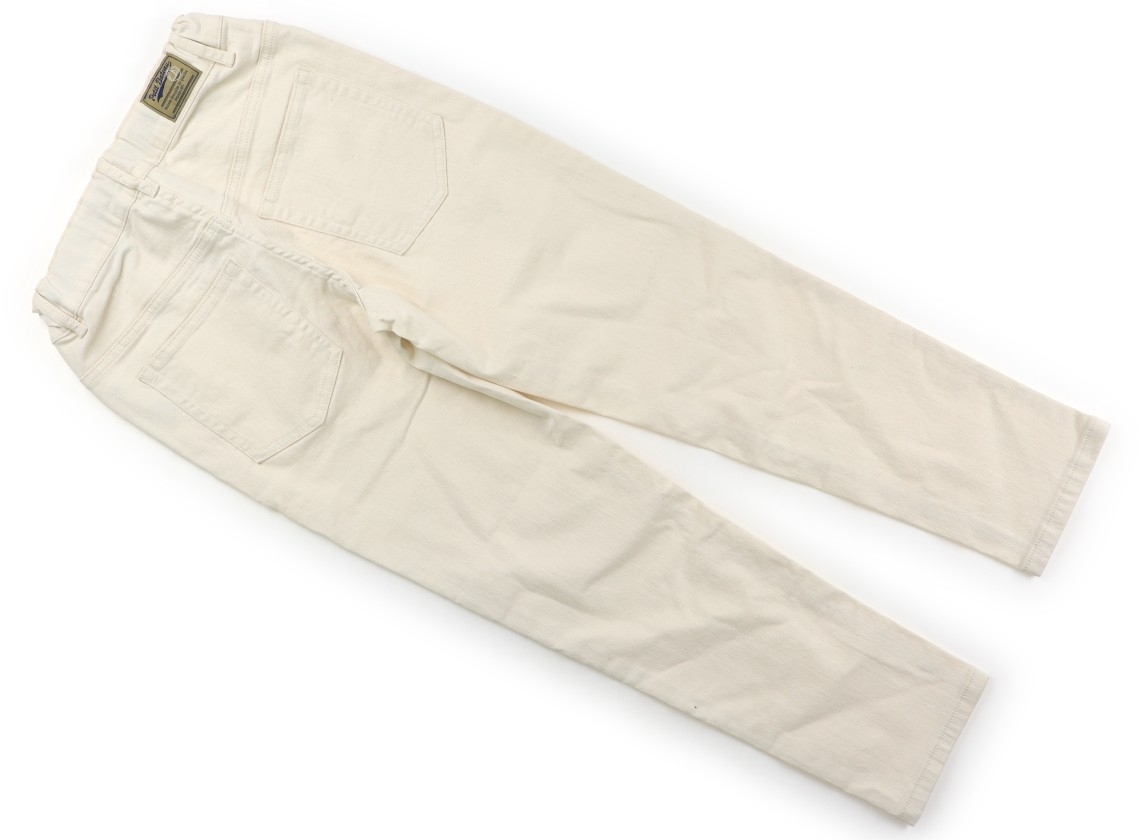 ストレッチデニム素材。前ファスナー開きで、ウエストにはサイズ調整ゴムが付いています。目立った汚れのない良品です。