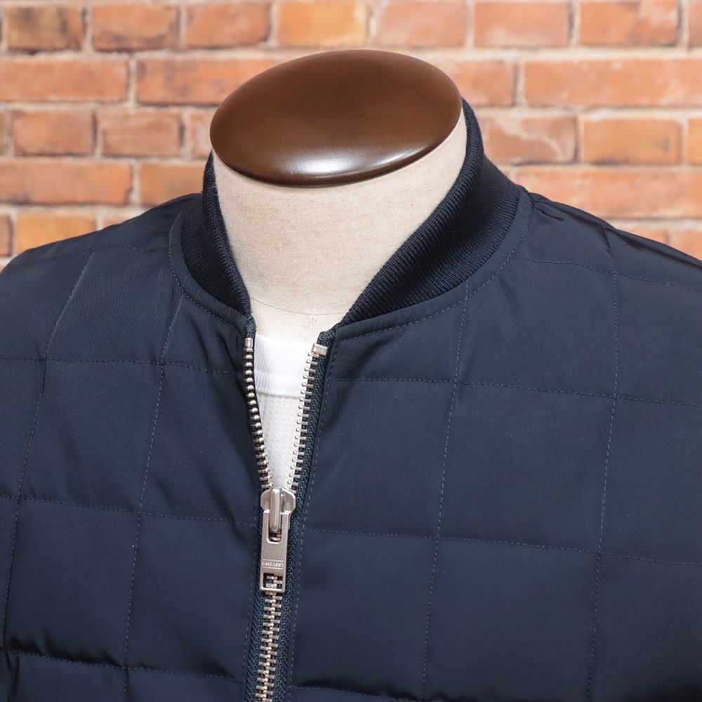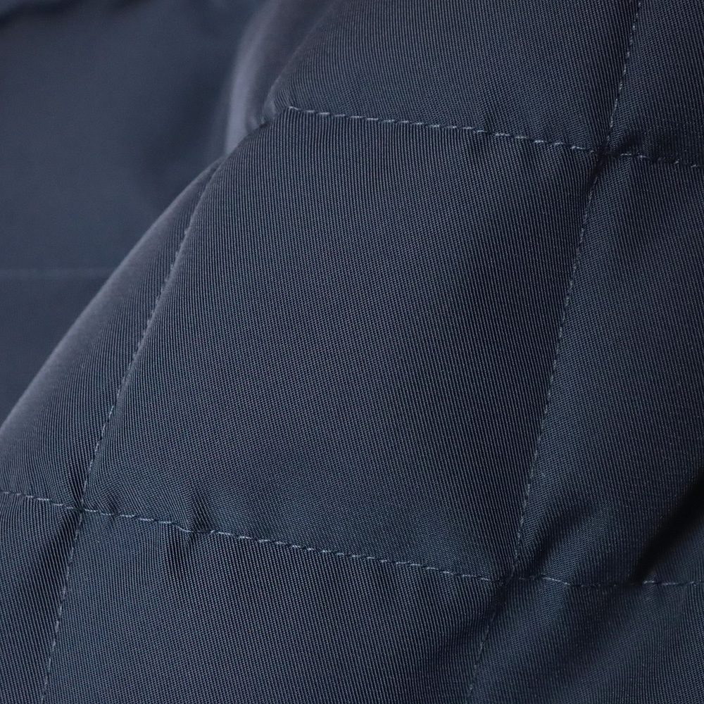 都市生活に馴染む機能性とミニマルな美しさを併せ持ったキルティングベスト。表地に採用した撥水ポリエステルツイルはマットな光沢と適度なハリを併せ持ち、雨や汚れをはじきながらも上品な印象を保ちます。中綿は保温性に優れたバッティングを使用しているため、軽やかな着心地ながら暖かさをキープ。首元は立ち上がりのある設計で風の侵入を抑え、フロントジップはスムーズな開閉で着脱がしやすく、両サイドのポケットは実用性とシルエットのバランスを両立させています。