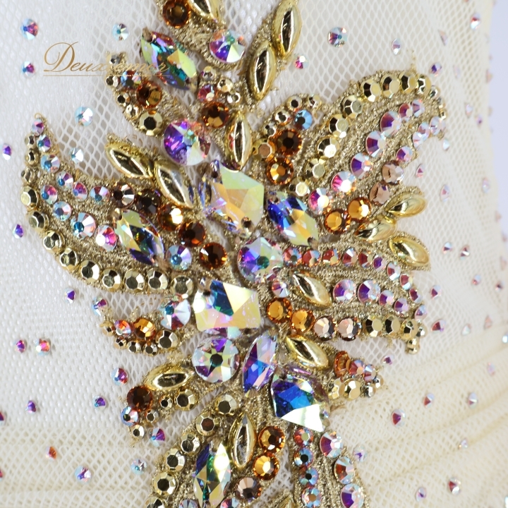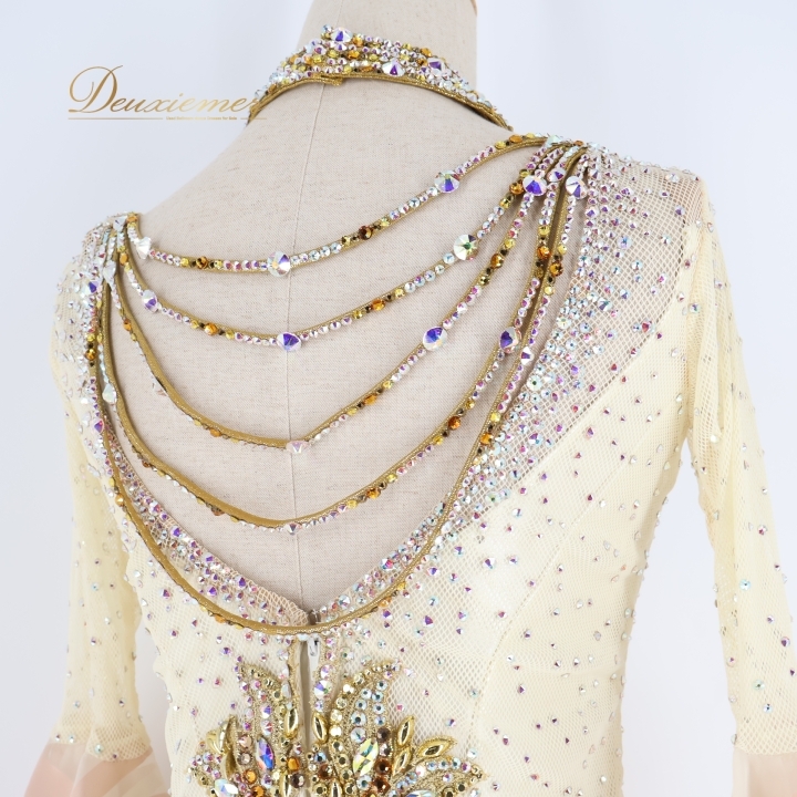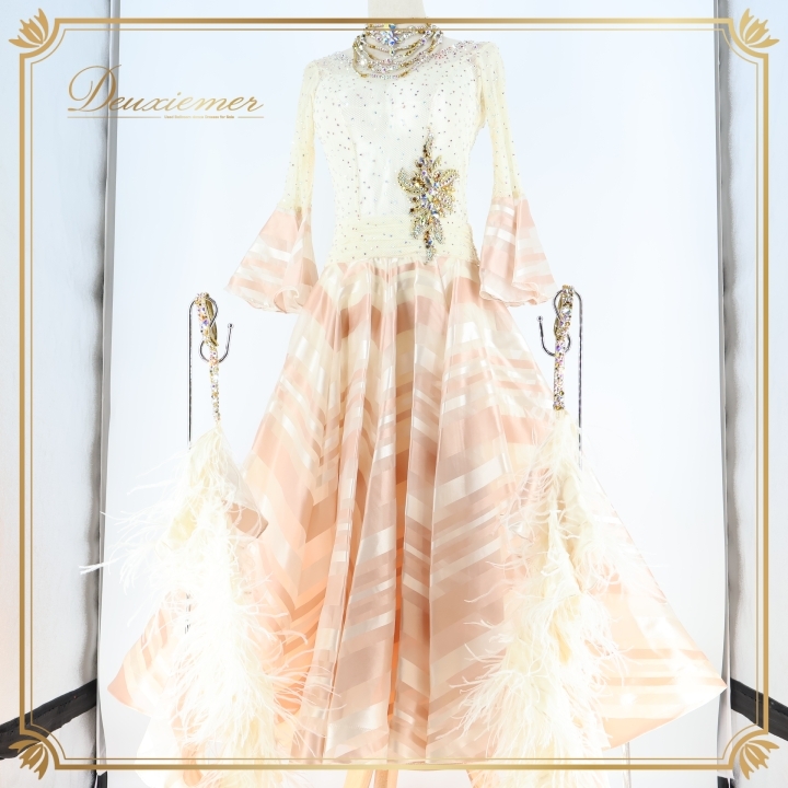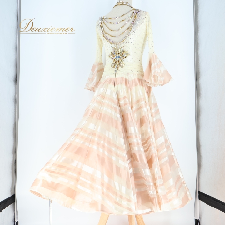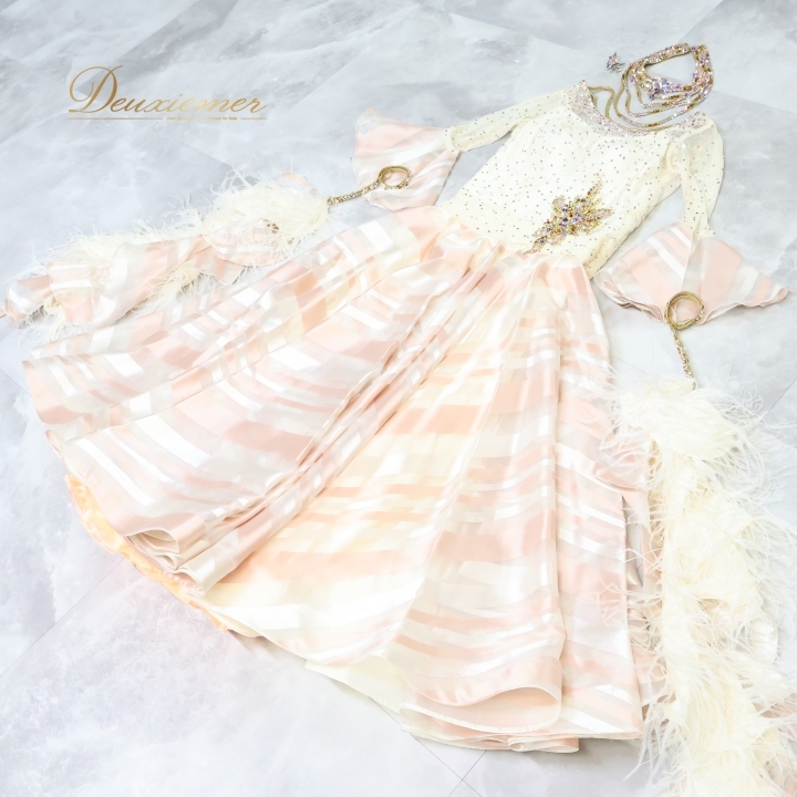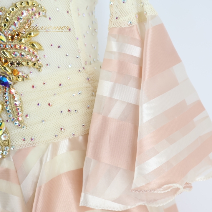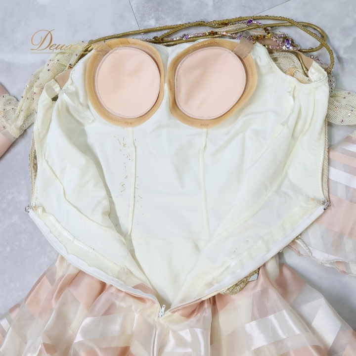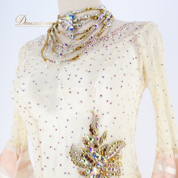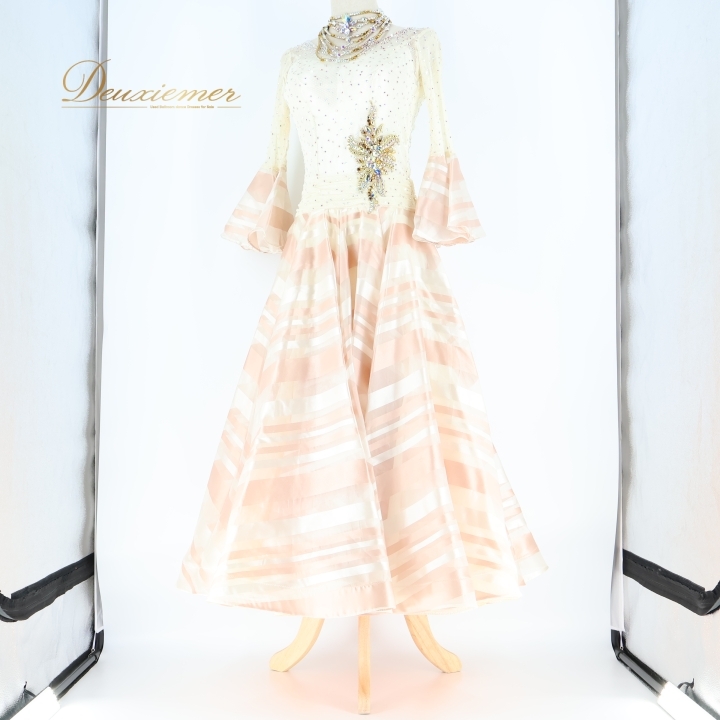 | 【商品名】社交ダンス 衣装 ワンピース ドレス 【サイズ】表記無し 平置き実測:総丈約125cm(裾~肩部まで)、身幅約37cm、ウエスト約34cm~ ※実測の為、多少の誤差はご了承ください ※9号のトルソーにはやや余裕がサイズ感です 【仕様】 ・背面ファスナー仕様 ・レオタード(ボタン)仕様 ・上半身のみ伸縮性有り ・胸パッド有り 【品質表示】 表示無し ------------------------------------ 【ポイント】 ▽アイボリー×ピンクゴールド系の明るい色味 ▽縞々スカートが珍しいデザイン ▽ふんわり柔らかい印象で綺麗なドレス ▽スカート3枚重ね ------------------------------------ 【撮影時使用トルソー】 種 類:女性用トルソー9号 (一般的に使用されるサイズです) サイズ:肩先~床約135cm(身長約160cm)、肩幅約38cm、バスト約86cm、ウエスト約64cm、ヒップ約84cm |