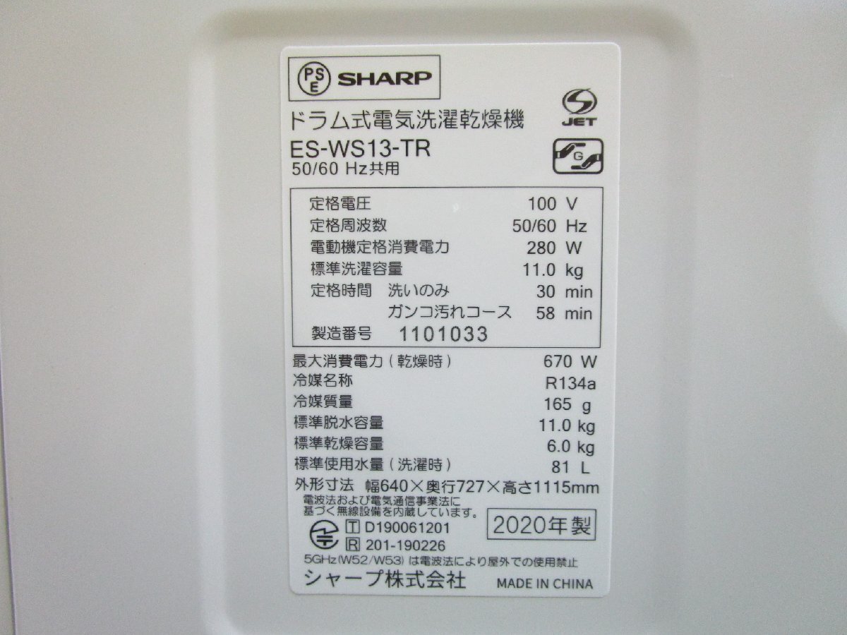 SHARP シャープ ドラム式洗濯機 洗濯11kg/乾燥6kg 自動投入 右開き ES-WS13-TR 2020年製 ジャンク