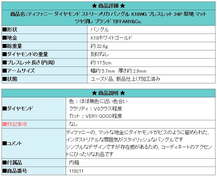| 商品名:ティファニー ダイヤモンド ストリーメリカ バングル K18WG ブレスレット 24P 梨地 マット ツヤ消し ブランド TIFFANY&Co. | |