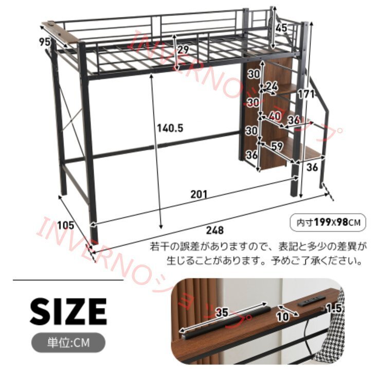 システムベット ロフトベッド シングル コンセント付き 収納付き ラック棚付き 耐荷重150kg 北欧風 二段ベッド 部屋二段ベッド スチール 耐