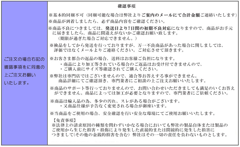 4.如果您的货品寄往日本本地,您在包裹签收前,请务必确认外包装是否有变形、破损、包装受潮、纸箱变色、纸箱重新封胶;商品是否破损、缺货。如有上述状况,您有权要求开封验货,以确认商品完整。如发现商品破损或少件,您务必用手机拍下破损情况,要求在快递单上写下实际情况且有权选择拒收,由快递公司来承担破损责任。并于当天告知我们,如未反馈,日拍网默认您货品完好,不承担任何责任。如果物品选择第三方物流(例如:第三方转运),请自行与第三方签订责任风险