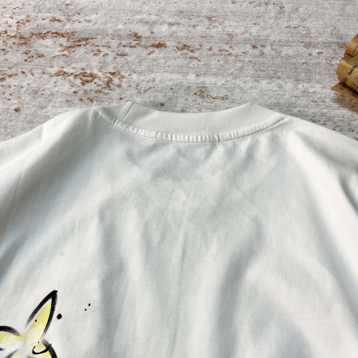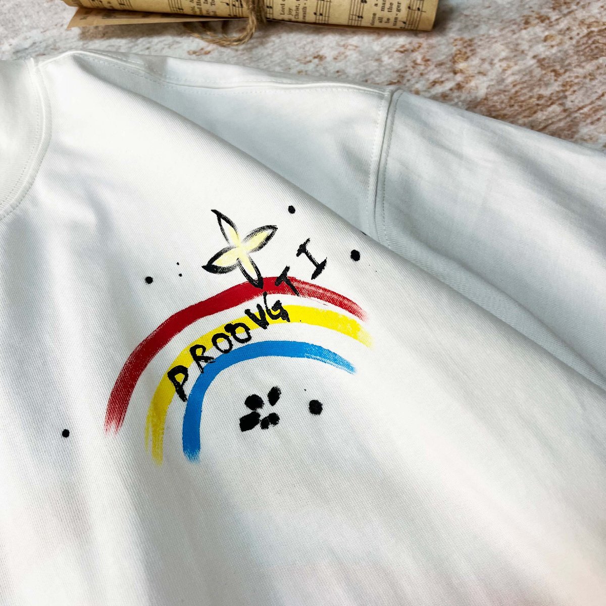 首回りは、どんなアイテムとも相性の良いクルーネックを採用。フロントはシンプルなデザインで清潔感があり、バックには大きなレインボーが施されています。一瞬で目を引くアートなデザインで、個性をしっかりアピール。