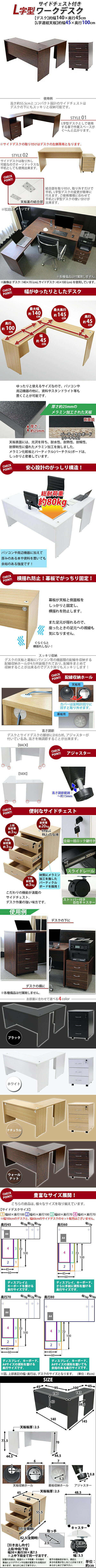 | 商品紹介 | ■作業スペースを広く確保出来る、L字型ワークデスクです。 ■サイドデスクの幅が約45cmのタイプです。 ■使いやすさ抜群の3段サイドチェスト付き。 ■引き出しは鍵を掛けると全段オールロック! ■会議室や事務所等、オフィス家具として様々なシーンでお使いいただけます。 ■天板には、メラミン加工を施しています。 ■幕板が天板と側面板をがっちりと固定!横揺れを防止します。 ■ネジ穴隠しのシール付き。(サイドデスクのみ付属) ■デスクの天板と幕板に配線収納ホールが2カ所ずつ備わっています。 ■アジャスターで高さの調節が可能です。(高さ調節範囲〜約15mm) ※こちらの商品は、組立て式です。組立てにはプラスドライバーが必要です。お客様でご用意ください。 ※組立図が付属します。 ※サイドデスクの取り付けはデスクの左側専用となります。 ■材質:パーティクル(パーチクル)ボード(メラミン加工)(本体、サイドデスク、サイドチェスト)、プラスチック(アジャスター、配線収納ホール、キャスター)、カークサイト(亜鉛合金)(取っ手、鍵)、スチール(スライドレール) ■重量:L字型デスク:約40kg (デスク:約24kg、サイドデスク:約16kg) サイドチェスト:約20kg ■L字型デスク総耐荷重:約80kg ■サイドチェスト耐荷重:約20kg(天板(引き出しに何も入っていない時))、約3kg(各引き出し) ■付属品:鍵2個(内スペアキー1個)、組立図 ●新品商品ではありますが、輸入商品の為、多少の擦り傷などがある場合がございますので、ご納得の上ご購入下さいませ。 ●ご購入後、お客様ご都合によるご返品、ご返金等は一切お受け致しておりません。 ●本商品を使用した際に発生したトラブル、事故につきまして、当社は一切の責任を負いません。ご使用に関しましては、全て自己責任にてお願い致します。 ※カラーはウォールナットとなっております。 |